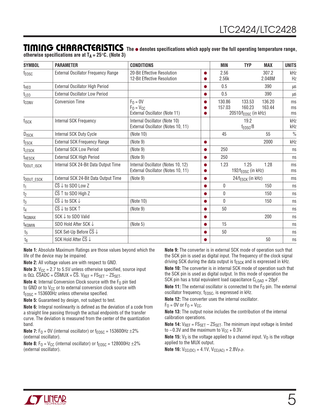 fEOSC External Oscillator Frequency Range 20-Bit Effective Resolution ● 2.56 307.2 kHz 12-Bit Effective Resolution ● 2.56k 2.048M Hz tHEO External Oscillator High Period ● 0.5 390 µs tLEO External Oscillator Low Period ● 0.5 390 µs tCONV Conversion Time FO = 0V ● 130.86 133.53 136.20 ms FO = VCC ● 157.03 160.23 163.44 ms External Oscillator (Note 11) ● 20510/fEOSC (in kHz) ms fISCK Internal SCK Frequency Internal Oscillator (Note 10) 19.2 kHz External Oscillator (Notes 10, 11) fEOSC/8 kHz DISCK Internal SCK Duty Cycle (Note 10) 45 55 % fESCK External SCK Frequency Range (Note 9) ● 2000 kHz tLESCK External SCK Low Period (Note 9) ● 250 ns tHESCK External SCK High Period (Note 9) ● 250 ns tDOUT_ISCK Internal SCK 24-Bit Data Output Time Internal Oscillator (Notes 10, 12) ● 1.23 1.25 1.28 ms External Oscillator (Notes 10, 11) ● 192/fEOSC (in kHz) ms tDOUT_ESCK External SCK 24-Bit Data Output Time (Note 9) ● 24/fESCK (in kHz) ms t1 CS ↓ to SDO Low Z ● 0 150 ns t2 CS ↑ to SDO High Z ● 0 150 ns t3 CS ↓ to SCK ↓ (Note 10) ● 0 150 ns t4 CS ↓ to SCK ↑ (Note 9) ● 50 ns tKQMAX SCK ↓ to SDO Valid ● 200 ns tKQMIN SDO Hold After SCK ↓ (Note 5) ● 15 ns t5 SCK Set-Up Before CS ↓ ● 50 ns t6 SCK Hold After CS ↓ ● 50 ns