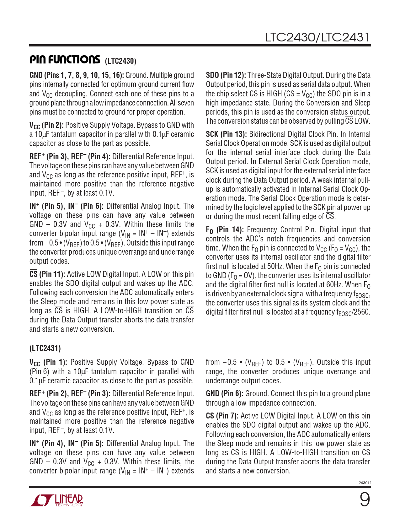 LTC2430/LTC2431 UUUPI FU CTIO S (LTC2430)GND (Pins 1, 7, 8, 9, 10, 15, 16): Ground. Multiple ground SDO (Pin 12): Three-State Digital Output. During the Data pins internally connected for optimum ground current flow Output period, this pin is used as serial data output. When and VCC decoupling. Connect each one of these pins to a the chip select CS is HIGH (CS = VCC) the SDO pin is in a ground plane through a low impedance connection. All seven high impedance state. During the Conversion and Sleep pins must be connected to ground for proper operation. periods, this pin is used as the conversion status output. The conversion status can be observed by pulling CS LOW. VCC (Pin 2): Positive Supply Voltage. Bypass to GND with a 10µF tantalum capacitor in parallel with 0.1µF ceramic SCK (Pin 13): Bidirectional Digital Clock Pin. In Internal capacitor as close to the part as possible. Serial Clock Operation mode, SCK is used as digital output for the internal serial interface clock during the Data REF+ (Pin 3), REF– (Pin 4): Differential Reference Input. Output period. In External Serial Clock Operation mode, The voltage on these pins can have any value between GND SCK is used as digital input for the external serial interface and VCC as long as the reference positive input, REF+, is clock during the Data Output period. A weak internal pull- maintained more positive than the reference negative up is automatically activated in Internal Serial Clock Op- input, REF –, by at least 0.1V. eration mode. The Serial Clock Operation mode is deter- IN+ (Pin 5), IN– (Pin 6): Differential Analog Input. The mined by the logic level applied to the SCK pin at power up voltage on these pins can have any value between or during the most recent falling edge of CS. GND – 0.3V and VCC + 0.3V. Within these limits the F converter bipolar input range (V O (Pin 14): Frequency Control Pin. Digital input that IN = IN+ – IN–) extends controls the ADC’s notch frequencies and conversion from – 0.5 • (VREF) to 0.5 • (VREF). Outside this input range time. When the F the converter produces unique overrange and underrange O pin is connected to VCC (FO = VCC), the converter uses its internal oscillator and the digital filter output codes. first null is located at 50Hz. When the FO pin is connected CS (Pin 11): Active LOW Digital Input. A LOW on this pin to GND (FO = OV), the converter uses its internal oscillator enables the SDO digital output and wakes up the ADC. and the digital filter first null is located at 60Hz. When FO Following each conversion the ADC automatically enters is driven by an external clock signal with a frequency fEOSC, the Sleep mode and remains in this low power state as the converter uses this signal as its system clock and the long as CS is HIGH. A LOW-to-HIGH transition on CS digital filter first null is located at a frequency fEOSC/2560. during the Data Output transfer aborts the data transfer and starts a new conversion. (LTC2431)VCC (Pin 1): Positive Supply Voltage. Bypass to GND from – 0.5 • (VREF) to 0.5 • (VREF). Outside this input (Pin␣ 6) with a 10µF tantalum capacitor in parallel with range, the converter produces unique overrange and 0.1µF ceramic capacitor as close to the part as possible. underrange output codes. REF+ (Pin 2), REF– (Pin 3): Differential Reference Input. GND (Pin 6): Ground. Connect this pin to a ground plane The voltage on these pins can have any value between GND through a low impedance connection. and VCC as long as the reference positive input, REF+, is CS (Pin 7): Active LOW Digital Input. A LOW on this pin maintained more positive than the reference negative enables the SDO digital output and wakes up the ADC. input, REF –, by at least 0.1V. Following each conversion, the ADC automatically enters IN+ (Pin 4), IN– (Pin 5): Differential Analog Input. The the Sleep mode and remains in this low power state as voltage on these pins can have any value between long as CS is HIGH. A LOW-to-HIGH transition on CS GND – 0.3V and VCC + 0.3V. Within these limits, the during the Data Output transfer aborts the data transfer converter bipolar input range (VIN = IN+ – IN–) extends and starts a new conversion. 24301f 9