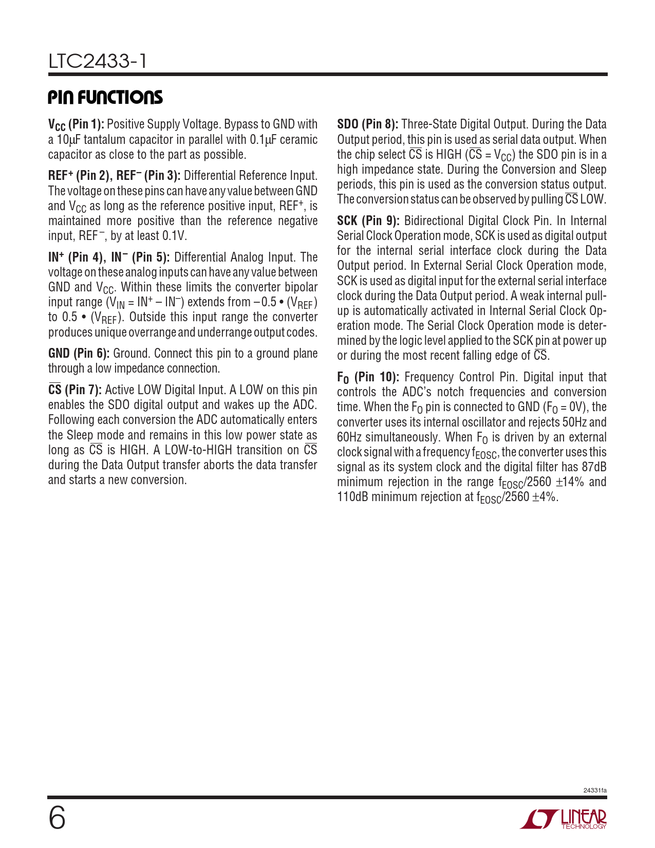 LTC2433-1 UUUPI FU CTIO SVCC (Pin 1): Positive Supply Voltage. Bypass to GND with SDO (Pin 8): Three-State Digital Output. During the Data a 10µF tantalum capacitor in parallel with 0.1µF ceramic Output period, this pin is used as serial data output. When capacitor as close to the part as possible. the chip select CS is HIGH (CS = VCC) the SDO pin is in a high impedance state. During the Conversion and Sleep REF+ (Pin 2), REF– (Pin 3): Differential Reference Input. periods, this pin is used as the conversion status output. The voltage on these pins can have any value between GND The conversion status can be observed by pulling CS LOW. and VCC as long as the reference positive input, REF+, is maintained more positive than the reference negative SCK (Pin 9): Bidirectional Digital Clock Pin. In Internal input, REF –, by at least 0.1V. Serial Clock Operation mode, SCK is used as digital output for the internal serial interface clock during the Data IN+ (Pin 4), IN– (Pin 5): Differential Analog Input. The Output period. In External Serial Clock Operation mode, voltage on these analog inputs can have any value between SCK is used as digital input for the external serial interface GND and VCC. Within these limits the converter bipolar clock during the Data Output period. A weak internal pull- input range (VIN = IN+ – IN–) extends from – 0.5 • (VREF) up is automatically activated in Internal Serial Clock Op- to 0.5 • (VREF). Outside this input range the converter eration mode. The Serial Clock Operation mode is deter- produces unique overrange and underrange output codes. mined by the logic level applied to the SCK pin at power up GND (Pin 6): Ground. Connect this pin to a ground plane or during the most recent falling edge of CS. through a low impedance connection. FO (Pin 10): Frequency Control Pin. Digital input that CS (Pin 7): Active LOW Digital Input. A LOW on this pin controls the ADC’s notch frequencies and conversion enables the SDO digital output and wakes up the ADC. time. When the FO pin is connected to GND (FO = 0V), the Following each conversion the ADC automatically enters converter uses its internal oscillator and rejects 50Hz and the Sleep mode and remains in this low power state as 60Hz simultaneously. When FO is driven by an external long as CS is HIGH. A LOW-to-HIGH transition on CS clock signal with a frequency fEOSC, the converter uses this during the Data Output transfer aborts the data transfer signal as its system clock and the digital filter has 87dB and starts a new conversion. minimum rejection in the range fEOSC/2560 ±14% and 110dB minimum rejection at fEOSC/2560 ±4%. 24331fa 6