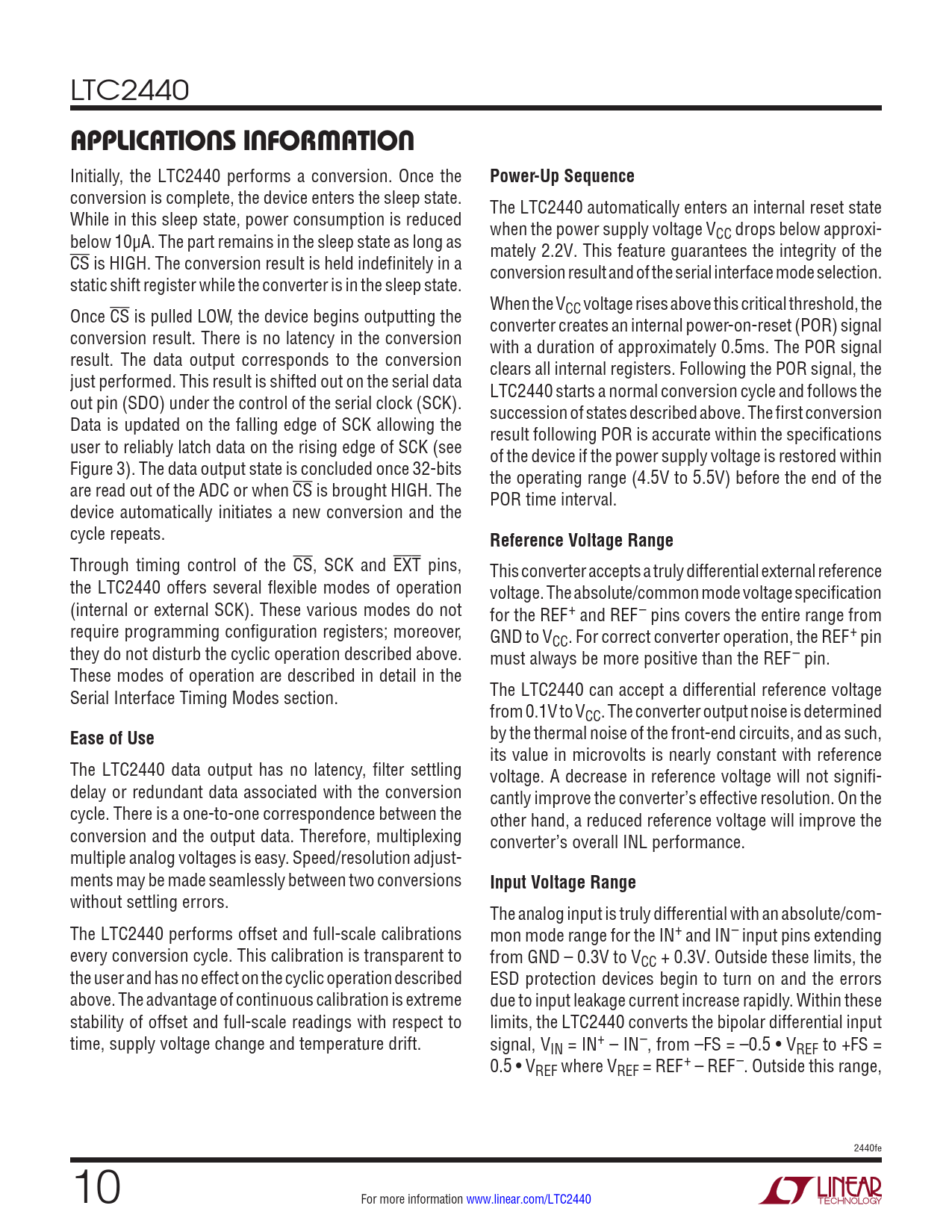 conversion is complete, the device enters the sleep state. The LTC2440 automatically enters an internal reset state While in this sleep state, power consumption is reduced when the power supply voltage V below 10µA. The part remains in the sleep state as long as CC drops below approxi- mately 2.2V. This feature guarantees the integrity of the CS is HIGH. The conversion result is held indefinitely in a conversion result and of the serial interface mode selection. static shift register while the converter is in the sleep state. When the V Once CS is pulled LOW, the device begins outputting the CC voltage rises above this critical threshold, the converter creates an internal power-on-reset (POR) signal conversion result. There is no latency in the conversion with a duration of approximately 0.5ms. The POR signal result. The data output corresponds to the conversion clears all internal registers. Following the POR signal, the just performed. This result is shifted out on the serial data LTC2440 starts a normal conversion cycle and follows the out pin (SDO) under the control of the serial clock (SCK). succession of states described above. The first conversion Data is updated on the falling edge of SCK allowing the result following POR is accurate within the specifications user to reliably latch data on the rising edge of SCK (see of the device if the power supply voltage is restored within Figure 3). The data output state is concluded once 32-bits the operating range (4.5V to 5.5V) before the end of the are read out of the ADC or when CS is brought HIGH. The POR time interval. device automatically initiates a new conversion and the cycle repeats.