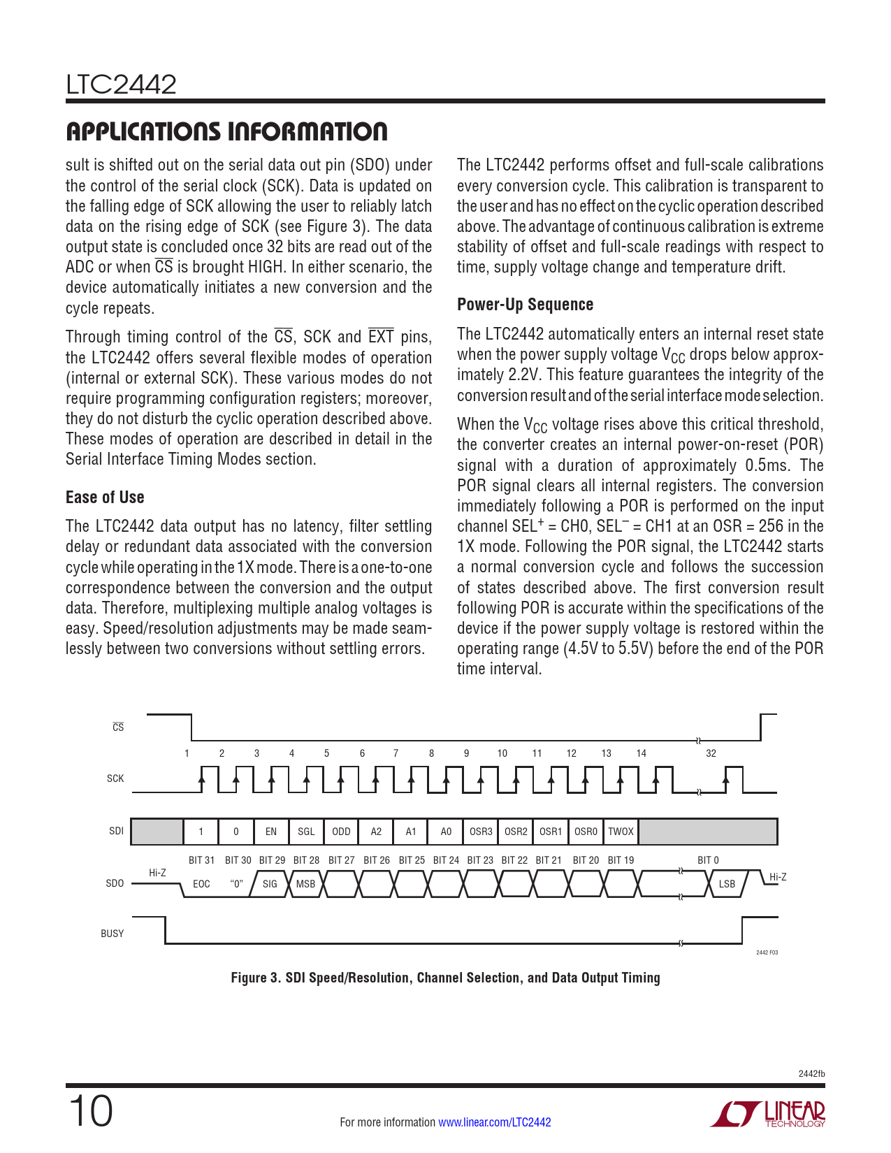 LTC2442 APPLICATIONS INFORMATION sult is shifted out on the serial data out pin (SDO) under The LTC2442 performs offset and full-scale calibrations the control of the serial clock (SCK). Data is updated on every conversion cycle. This calibration is transparent to the falling edge of SCK allowing the user to reliably latch the user and has no effect on the cyclic operation described data on the rising edge of SCK (see Figure 3). The data above. The advantage of continuous calibration is extreme output state is concluded once 32 bits are read out of the stability of offset and full-scale readings with respect to ADC or when CS is brought HIGH. In either scenario, the time, supply voltage change and temperature drift. device automatically initiates a new conversion and the cycle repeats. Power-Up Sequence Through timing control of the CS, SCK and EXT pins, The LTC2442 automatically enters an internal reset state the LTC2442 offers several flexible modes of operation when the power supply voltage VCC drops below approx- (internal or external SCK). These various modes do not imately 2.2V. This feature guarantees the integrity of the require programming configuration registers; moreover, conversion result and of the serial interface mode selection. they do not disturb the cyclic operation described above. When the V These modes of operation are described in detail in the CC voltage rises above this critical threshold, the converter creates an internal power-on-reset (POR) Serial Interface Timing Modes section. signal with a duration of approximately 0.5ms. The POR signal clears all internal registers. The conversion Ease of Use immediately following a POR is performed on the input The LTC2442 data output has no latency, filter settling channel SEL+ = CH0, SEL– = CH1 at an OSR = 256 in the delay or redundant data associated with the conversion 1X mode. Following the POR signal, the LTC2442 starts cycle while operating in the 1X mode. There is a one-to-one a normal conversion cycle and follows the succession correspondence between the conversion and the output of states described above. The first conversion result data. Therefore, multiplexing multiple analog voltages is following POR is accurate within the specifications of the easy. Speed/resolution adjustments may be made seam- device if the power supply voltage is restored within the lessly between two conversions without settling errors. operating range (4.5V to 5.5V) before the end of the POR time interval. CS 1 2 3 4 5 6 7 8 9 10 11 12 13 14 32 SCK SDI 1 0 EN SGL ODD A2 A1 A0 OSR3 OSR2 OSR1 OSR0 TWOX BIT 31 BIT 30 BIT 29 BIT 28 BIT 27 BIT 26 BIT 25 BIT 24 BIT 23 BIT 22 BIT 21 BIT 20 BIT 19 BIT 0 Hi-Z Hi-Z SDO EOC “0” SIG MSB LSB BUSY 2442 F03 Figure 3. SDI Speed/Resolution, Channel Selection, and Data Output Timing 2442fb 10 For more information www.linear.com/LTC2442