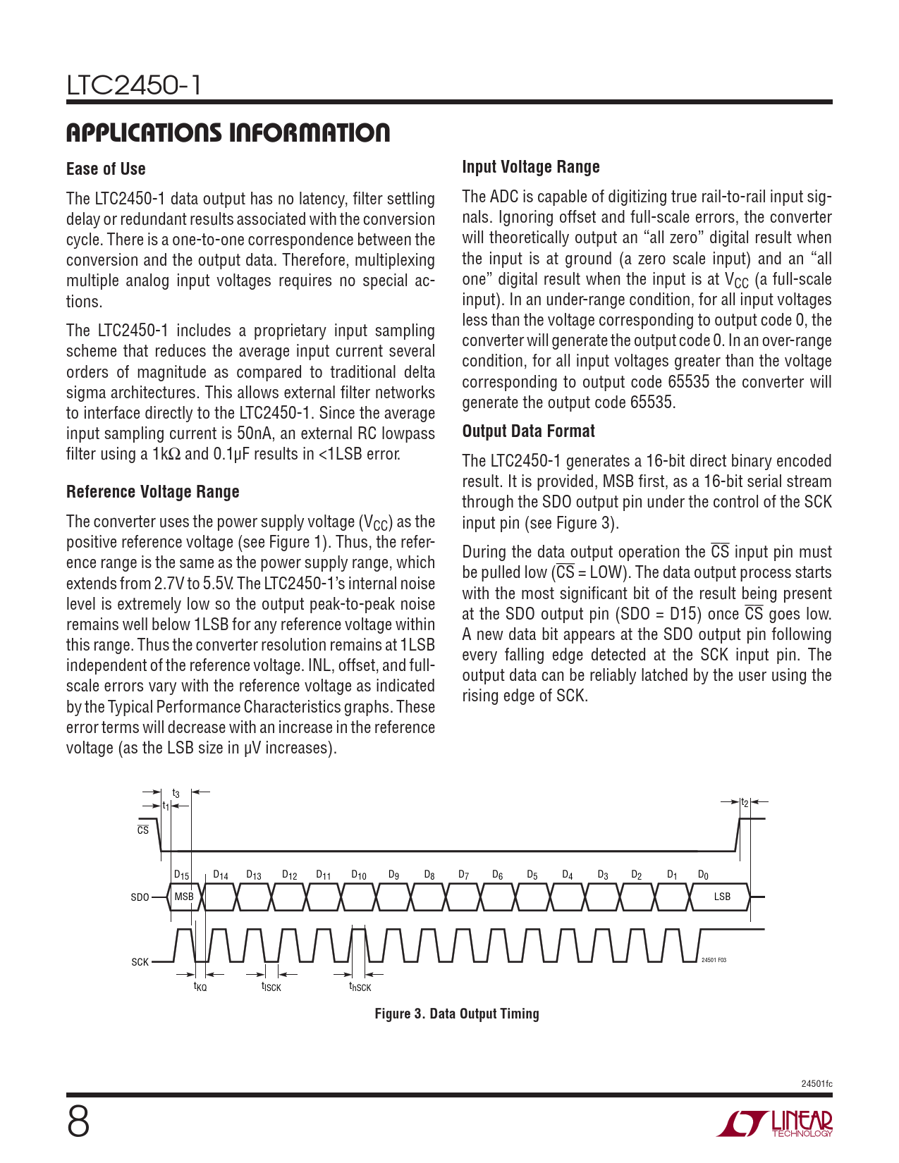 LTC2450-1 APPLICATIONS INFORMATIONEase of UseInput Voltage Range The LTC2450-1 data output has no latency, fi lter settling The ADC is capable of digitizing true rail-to-rail input sig- delay or redundant results associated with the conversion nals. Ignoring offset and full-scale errors, the converter cycle. There is a one-to-one correspondence between the will theoretically output an “all zero” digital result when conversion and the output data. Therefore, multiplexing the input is at ground (a zero scale input) and an “all multiple analog input voltages requires no special ac- one” digital result when the input is at VCC (a full-scale tions. input). In an under-range condition, for all input voltages less than the voltage corresponding to output code 0, the The LTC2450-1 includes a proprietary input sampling converter will generate the output code 0. In an over-range scheme that reduces the average input current several condition, for all input voltages greater than the voltage orders of magnitude as compared to traditional delta corresponding to output code 65535 the converter will sigma architectures. This allows external fi lter networks generate the output code 65535. to interface directly to the LTC2450-1. Since the average input sampling current is 50nA, an external RC lowpass Output Data Format fi lter using a 1kΩ and 0.1μF results in <1LSB error. The LTC2450-1 generates a 16-bit direct binary encoded result. It is provided, MSB fi rst, as a 16-bit serial stream Reference Voltage Range through the SDO output pin under the control of the SCK The converter uses the power supply voltage (VCC) as the input pin (see Figure 3). positive reference voltage (see Figure 1). Thus, the refer- During the data output operation the CS input pin must ence range is the same as the power supply range, which be pulled low (CS = LOW). The data output process starts extends from 2.7V to 5.5V. The LTC2450-1’s internal noise with the most signifi cant bit of the result being present level is extremely low so the output peak-to-peak noise at the SDO output pin (SDO = D15) once CS goes low. remains well below 1LSB for any reference voltage within A new data bit appears at the SDO output pin following this range. Thus the converter resolution remains at 1LSB every falling edge detected at the SCK input pin. The independent of the reference voltage. INL, offset, and full- output data can be reliably latched by the user using the scale errors vary with the reference voltage as indicated rising edge of SCK. by the Typical Performance Characteristics graphs. These error terms will decrease with an increase in the reference voltage (as the LSB size in μV increases). t3 t t 1 2 CS D15 D14 D13 D12 D11 D10 D9 D8 D7 D6 D5 D4 D3 D2 D D 1 0 SDO MSB LSB SCK 24501 F03 tKQ tlSCK thSCK Figure 3. Data Output Timing 24501fc 8