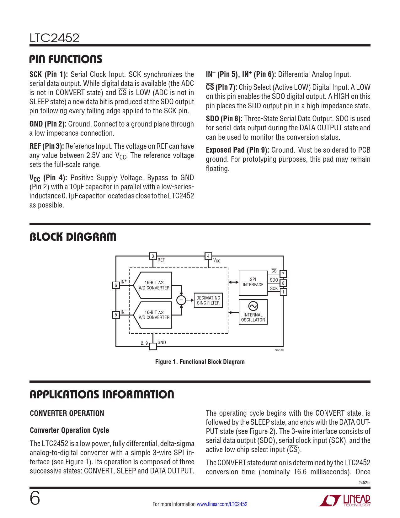 3 4 REF VCC CS 7 IN+ SPI 16-BIT SDO ΔΣ 6 INTERFACE 8 A/D CONVERTER SCK 1 DECIMATING – SINC FILTER IN– 16-BIT ΔΣ 5 A/D CONVERTER INTERNAL OSCILLATOR 2, 9 GND 2452 BD