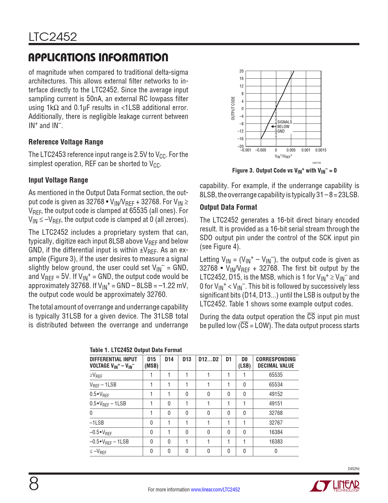 Table 1. LTC2452 Output Data Format DIFFERENTIAL INPUT D15 D14 D13 D12...D2 D1 D0 CORRESPONDING VOLTAGE V + IN – VIN (MSB) (LSB) DECIMAL VALUE