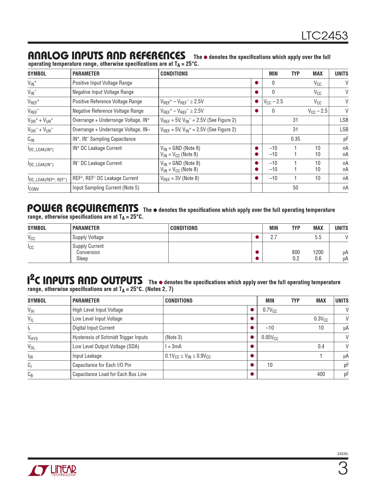 LTC2453 ANALOG INPUTS AND REFERENCES The l denotes the specifications which apply over the fulloperating temperature range, otherwise specifications are at TA = 25°C.SYMBOLPARAMETERCONDITIONSMINTYPMAXUNITS V + IN Positive Input Voltage Range l 0 VCC V V – IN Negative Input Voltage Range l 0 VCC V V + + – REF Positive Reference Voltage Range VREF – VREF ≥ 2.5V l VCC – 2.5 VCC V V – + – REF Negative Reference Voltage Range VREF – VREF ≥ 2.5V l 0 VCC – 2.5 V V + + – OR + VUR Overrange + Underrange Voltage, IN+ VREF = 5V, VIN = 2.5V (See Figure 2) 31 LSB V – – + OR + VUR Overrange + Underrange Voltage, IN– VREF = 5V, VIN = 2.5V (See Figure 2) 31 LSB CIN IN+, IN– Sampling Capacitance 0.35 pF IDC_LEAK(IN+) IN+ DC Leakage Current VIN = GND (Note 8) l –10 1 10 nA VIN = VCC (Note 8) l –10 1 10 nA IDC_LEAK(IN–) IN– DC Leakage Current VIN = GND (Note 8) l –10 1 10 nA VIN = VCC (Note 8) l –10 1 10 nA IDC_LEAK(REF+, REF–) REF+, REF– DC Leakage Current VREF = 3V (Note 8) l –10 1 10 nA ICONV Input Sampling Current (Note 5) 50 nA POWER REQUIREMENTS The l denotes the specifications which apply over the full operating temperaturerange, otherwise specifications are at TA = 25°C. SYMBOLPARAMETERCONDITIONSMINTYPMAXUNITS VCC Supply Voltage l 2.7 5.5 V ICC Supply Current Conversion l 800 1200 µA Sleep l 0.2 0.6 µA I2C INPUTS AND OUTPUTS The l denotes the specifications which apply over the full operating temperaturerange, otherwise specifications are at TA = 25°C. (Notes 2, 7) SYMBOLPARAMETERCONDITIONSMINTYPMAXUNITS VIH High Level Input Voltage l 0.7VCC V VIL Low Level Input Voltage l 0.3VCC V II Digital Input Current l –10 10 µA VHYS Hysteresis of Schmidt Trigger Inputs (Note 3) l 0.05VCC V VOL Low Level Output Voltage (SDA) I = 3mA l 0.4 V IIN Input Leakage 0.1VCC ≤ VIN ≤ 0.9VCC l 1 µA CI Capacitance for Each I/O Pin l 10 pF CB Capacitance Load for Each Bus Line l 400 pF 2453fc 3 Document Outline Features Applications Description Typical Application Absolute Maximum Ratings Pin Configuration Order Information Electrical Characteristics Analog Inputs And References Power Requirements I2C Inputs And Outputs I2C Timing Characteristics Typical Performance Characteristics Pin Functions Block Diagram Applications Information Typical Application Package Description Revision History Related Parts