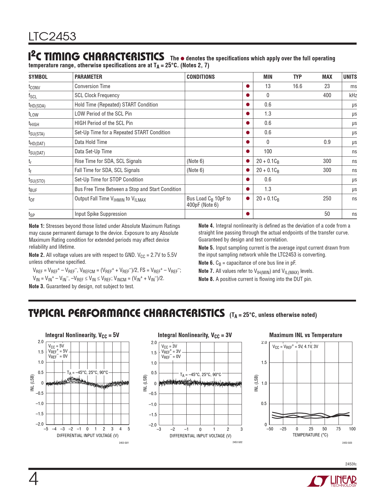 LTC2453 I2C TIMING CHARACTERISTICS The l denotes the specifications which apply over the full operatingtemperature range, otherwise specifications are at TA = 25°C. (Notes 2, 7) SYMBOLPARAMETERCONDITIONSMINTYPMAXUNITS tCONV Conversion Time l 13 16.6 23 ms fSCL SCL Clock Frequency l 0 400 kHz tHD(SDA) Hold Time (Repeated) START Condition l 0.6 µs tLOW LOW Period of the SCL Pin l 1.3 µs tHIGH HIGH Period of the SCL Pin l 0.6 µs tSU(STA) Set-Up Time for a Repeated START Condition l 0.6 µs tHD(DAT) Data Hold Time l 0 0.9 µs tSU(DAT) Data Set-Up Time l 100 ns tr Rise Time for SDA, SCL Signals (Note 6) l 20 + 0.1CB 300 ns tf Fall Time for SDA, SCL Signals (Note 6) l 20 + 0.1CB 300 ns tSU(STO) Set-Up Time for STOP Condition l 0.6 µs tBUF Bus Free Time Between a Stop and Start Condition l 1.3 µs tOF Output Fall Time VIHMIN to VILMAX Bus Load CB 10pF to l 20 + 0.1CB 250 ns 400pF (Note 6) tSP Input Spike Suppression l 50 ns Note 1: Stresses beyond those listed under Absolute Maximum Ratings Note 4. Integral nonlinearity is defined as the deviation of a code from a may cause permanent damage to the device. Exposure to any Absolute straight line passing through the actual endpoints of the transfer curve. Maximum Rating condition for extended periods may affect device Guaranteed by design and test correlation. reliability and lifetime. Note 5. Input sampling current is the average input current drawn from Note 2. All voltage values are with respect to GND. VCC = 2.7V to 5.5V the input sampling network while the LTC2453 is converting. unless otherwise specified. Note 6. CB = capacitance of one bus line in pF. V + – + – + – REF = VREF – VREF , VREFCM = (VREF + VREF )/2, FS = VREF – VREF ; Note 7. All values refer to VIH(MIN) and VIL(MAX) levels. V + – + – IN = VIN – VIN , –VREF ≤ VIN ≤ VREF; VINCM = (VIN + VIN )/2. Note 8. A positive current is flowing into the DUT pin. Note 3. Guaranteed by design, not subject to test. TYPICAL PERFORMANCE CHARACTERISTICS (TA = 25°C, unless otherwise noted)Integral Nonlinearity, VCC = 5VIntegral Nonlinearity, VCC = 3VMaximum INL vs Temperature 2.0 2.0 2.0 VCC = 5V V + CC = 3V VCC = VREF = 5V, 4.1V, 3V 1.5 V + + REF = 5V 1.5 VREF = 3V V – – REF = 0V VREF = 0V 1.0 1.0 1.5 0.5 TA = –45°C, 25°C, 90°C 0.5 TA = –45°C, 25°C, 90°C 0 0 1.0 INL (LSB) INL (LSB) INL (LSB) –0.5 –0.5 –1.0 –1.0 0.5 –1.5 –1.5 –2.0 –2.0 0 –5 –4 –3 –2 –1 0 1 2 3 4 5 –3 –2 –1 0 1 2 3 –50 –25 0 25 50 75 100 DIFFERENTIAL INPUT VOLTAGE (V) DIFFERENTIAL INPUT VOLTAGE (V) TEMPERATURE (°C) 2453 G01 2453 G02 2453 G03 2453fc 4 Document Outline Features Applications Description Typical Application Absolute Maximum Ratings Pin Configuration Order Information Electrical Characteristics Analog Inputs And References Power Requirements I2C Inputs And Outputs I2C Timing Characteristics Typical Performance Characteristics Pin Functions Block Diagram Applications Information Typical Application Package Description Revision History Related Parts