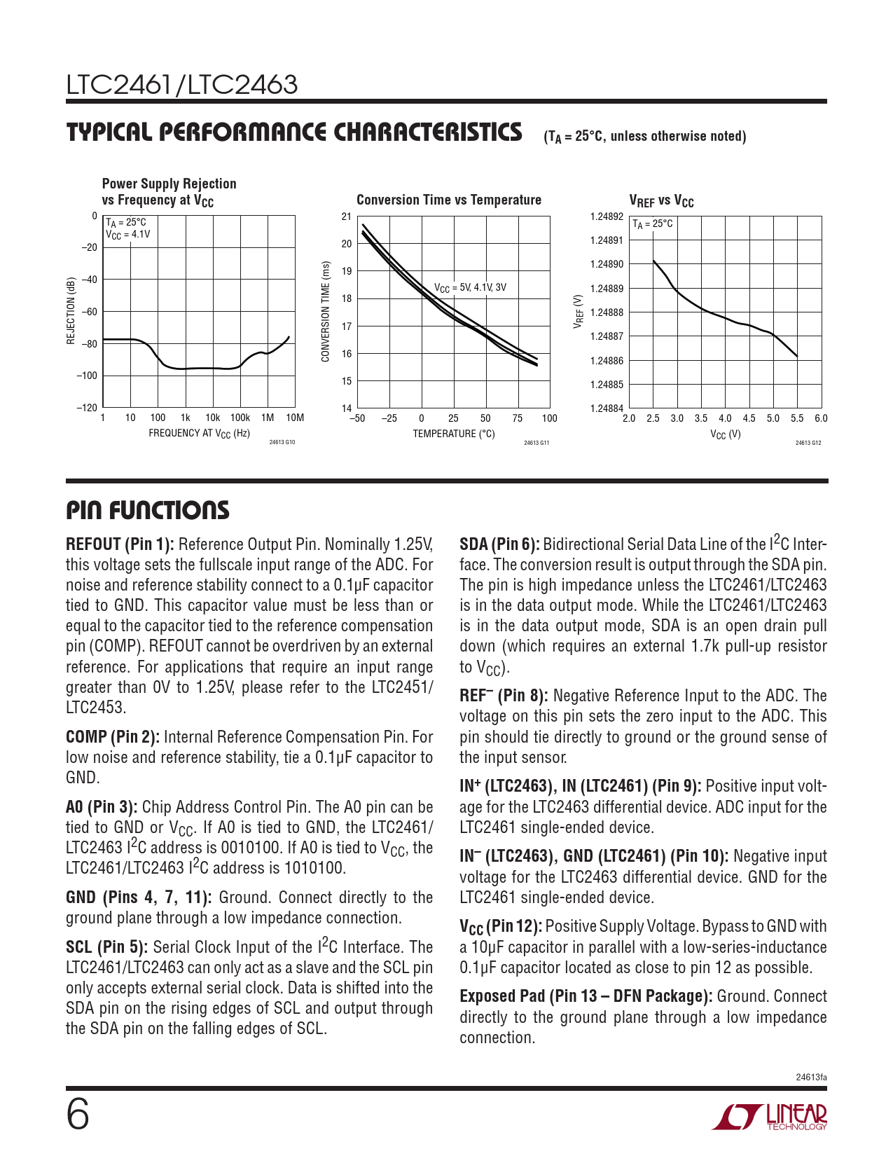 LTC2461/LTC2463 TYPICAL PERFORMANCE CHARACTERISTICS (TA = 25°C, unless otherwise noted)Power Supply Rejectionvs Frequency at VCCConversion Time vs TemperatureVREF vs VCC 0 T 21 1.24892 A = 25°C TA = 25°C VCC = 4.1V 1.24891 –20 20 1.24890 19 –40 VCC = 5V, 4.1V, 3V 1.24889 18 –60 (V) 1.24888 17 V REF REJECTION (dB) 1.24887 –80 CONVERSION TIME (ms) 16 1.24886 –100 15 1.24885 –120 14 1.24884 1 10 100 1k 10k 100k 1M 10M –50 –25 0 25 50 75 100 2.0 2.5 3.0 3.5 4.0 4.5 5.0 5.5 6.0 FREQUENCY AT VCC (Hz) TEMPERATURE (°C) VCC (V) 24613 G10 24613 G11 24613 G12 PIN FUNCTIONS REFOUT (Pin 1): Reference Output Pin. Nominally 1.25V, SDA (Pin 6): Bidirectional Serial Data Line of the I2C Inter- this voltage sets the fullscale input range of the ADC. For face. The conversion result is output through the SDA pin. noise and reference stability connect to a 0.1µF capacitor The pin is high impedance unless the LTC2461/LTC2463 tied to GND. This capacitor value must be less than or is in the data output mode. While the LTC2461/LTC2463 equal to the capacitor tied to the reference compensation is in the data output mode, SDA is an open drain pull pin (COMP). REFOUT cannot be overdriven by an external down (which requires an external 1.7k pull-up resistor reference. For applications that require an input range to VCC). greater than 0V to 1.25V, please refer to the LTC2451/ REF– (Pin 8): Negative Reference Input to the ADC. The LTC2453. voltage on this pin sets the zero input to the ADC. This COMP (Pin 2): Internal Reference Compensation Pin. For pin should tie directly to ground or the ground sense of low noise and reference stability, tie a 0.1μF capacitor to the input sensor. GND. IN+ (LTC2463), IN (LTC2461) (Pin 9): Positive input volt- A0 (Pin 3): Chip Address Control Pin. The A0 pin can be age for the LTC2463 differential device. ADC input for the tied to GND or VCC. If A0 is tied to GND, the LTC2461/ LTC2461 single-ended device. LTC2463 I2C address is 0010100. If A0 is tied to VCC, the IN– (LTC2463), GND (LTC2461) (Pin 10): Negative input LTC2461/LTC2463 I2C address is 1010100. voltage for the LTC2463 differential device. GND for the GND (Pins 4, 7, 11): Ground. Connect directly to the LTC2461 single-ended device. ground plane through a low impedance connection. VCC (Pin 12): Positive Supply Voltage. Bypass to GND with SCL (Pin 5): Serial Clock Input of the I2C Interface. The a 10μF capacitor in parallel with a low-series-inductance LTC2461/LTC2463 can only act as a slave and the SCL pin 0.1μF capacitor located as close to pin 12 as possible. only accepts external serial clock. Data is shifted into the Exposed Pad (Pin 13 – DFN Package): Ground. Connect SDA pin on the rising edges of SCL and output through directly to the ground plane through a low impedance the SDA pin on the falling edges of SCL. connection. 24613fa 6 Document Outline Features Description Applications Typical Application Absolute Maximum Ratings Pin Configuration Order Information Applications Information Package Description Electrical Characteristics Analog Inputs Power Requirements I2c Inputs and Outputs I2c Timing Characteristics Typical Performance Characteristics Pin Functions Block Diagram Applications Information Package Description Revision History Typical Application Related Parts