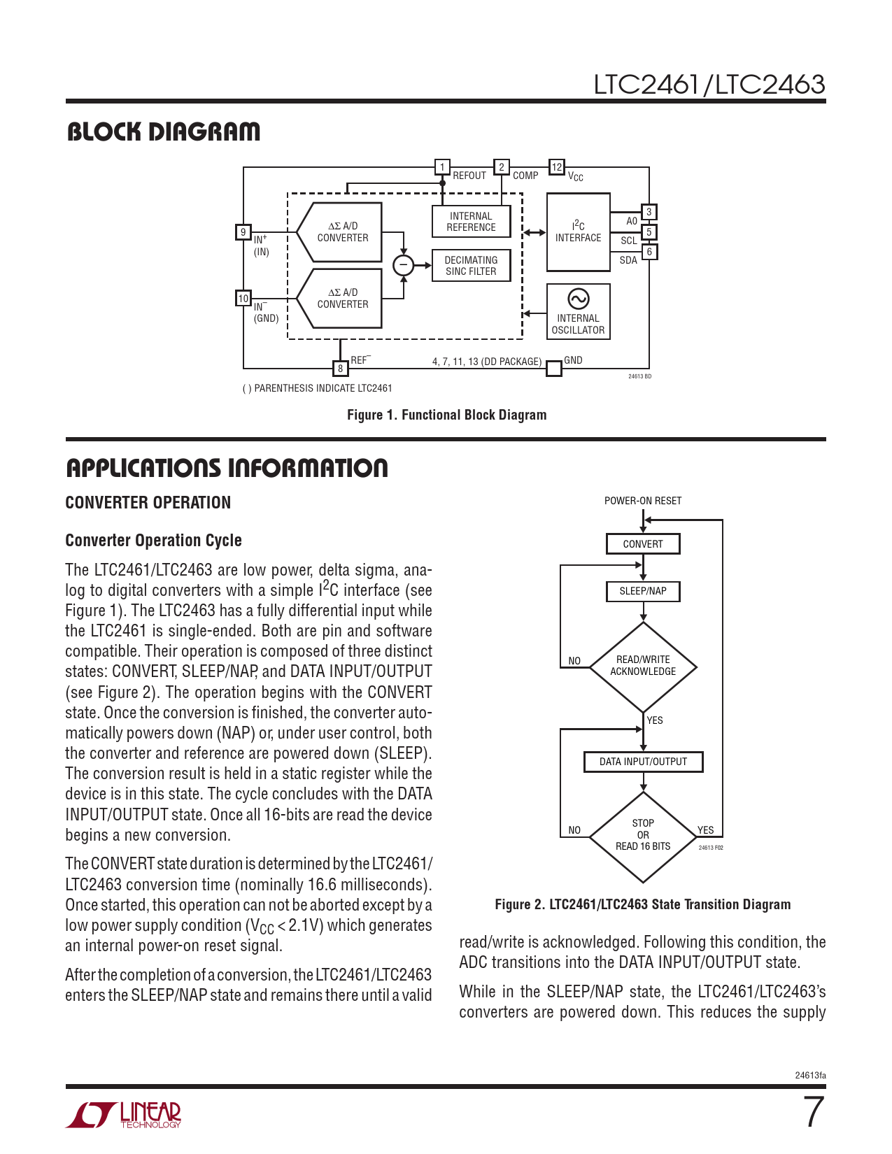 LTC2461/LTC2463 BLOCK DIAGRAM 1 2 12 REFOUT COMP VCC INTERNAL 3 ∆Σ A/D A0 REFERENCE I2C 9 5 IN+ CONVERTER INTERFACE SCL (IN) 6 DECIMATING SDA – SINC FILTER ∆Σ A/D 10 IN– CONVERTER (GND) INTERNAL OSCILLATOR REF– 4, 7, 11, 13 (DD PACKAGE) GND 8 24613 BD ( ) PARENTHESIS INDICATE LTC2461 Figure 1. Functional Block DiagramAPPLICATIONS INFORMATION CONVERTER OPERATION POWER-ON RESET Converter Operation Cycle CONVERT The LTC2461/LTC2463 are low power, delta sigma, ana- log to digital converters with a simple I2C interface (see SLEEP/NAP Figure 1). The LTC2463 has a fully differential input while the LTC2461 is single-ended. Both are pin and software compatible. Their operation is composed of three distinct NO READ/WRITE states: CONVERT, SLEEP/NAP, and DATA INPUT/OUTPUT ACKNOWLEDGE (see Figure 2). The operation begins with the CONVERT state. Once the conversion is finished, the converter auto- YES matically powers down (NAP) or, under user control, both the converter and reference are powered down (SLEEP). DATA INPUT/OUTPUT The conversion result is held in a static register while the device is in this state. The cycle concludes with the DATA INPUT/OUTPUT state. Once all 16-bits are read the device STOP begins a new conversion. NO OR YES READ 16 BITS 24613 F02 The CONVERT state duration is determined by the LTC2461/ LTC2463 conversion time (nominally 16.6 milliseconds). Once started, this operation can not be aborted except by a Figure 2. LTC2461/LTC2463 State Transition Diagram low power supply condition (VCC < 2.1V) which generates an internal power-on reset signal. read/write is acknowledged. Following this condition, the ADC transitions into the DATA INPUT/OUTPUT state. After the completion of a conversion, the LTC2461/LTC2463 enters the SLEEP/NAP state and remains there until a valid While in the SLEEP/NAP state, the LTC2461/LTC2463’s converters are powered down. This reduces the supply 24613fa 7 Document Outline Features Description Applications Typical Application Absolute Maximum Ratings Pin Configuration Order Information Applications Information Package Description Electrical Characteristics Analog Inputs Power Requirements I2c Inputs and Outputs I2c Timing Characteristics Typical Performance Characteristics Pin Functions Block Diagram Applications Information Package Description Revision History Typical Application Related Parts
