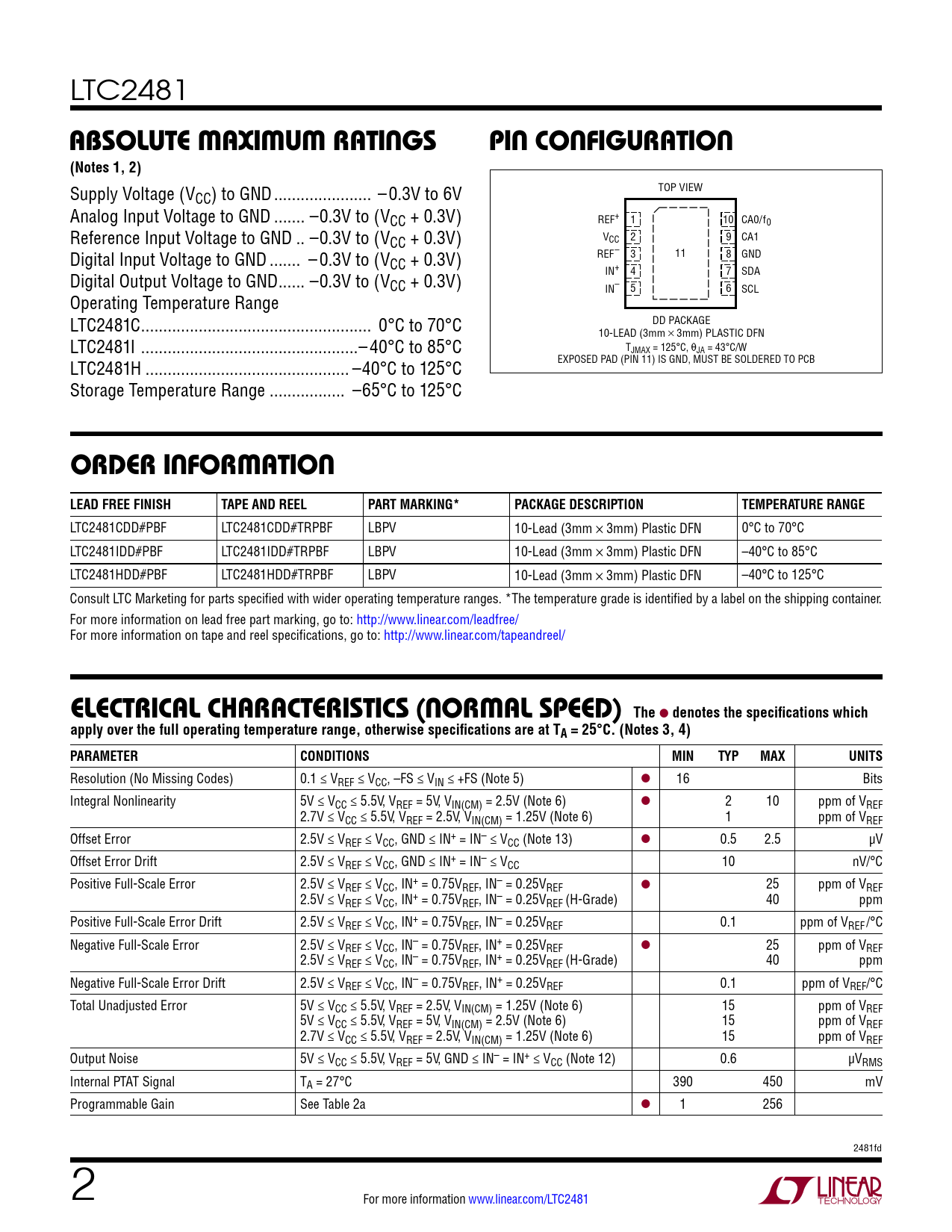 LTC2481CDD#PBF LTC2481CDD#TRPBF LBPV 10-Lead (3mm × 3mm) Plastic DFN 0°C to 70°C LTC2481IDD#PBF LTC2481IDD#TRPBF LBPV 10-Lead (3mm × 3mm) Plastic DFN –40°C to 85°C LTC2481HDD#PBF LTC2481HDD#TRPBF LBPV 10-Lead (3mm × 3mm) Plastic DFN –40°C to 125°C Consult LTC Marketing for parts specified with wider operating temperature ranges. *The temperature grade is identified by a label on the shipping container. For more information on lead free part marking, go to: http://www.linear.com/leadfree/ For more information on tape and reel specifications, go to: http://www.linear.com/tapeandreel/