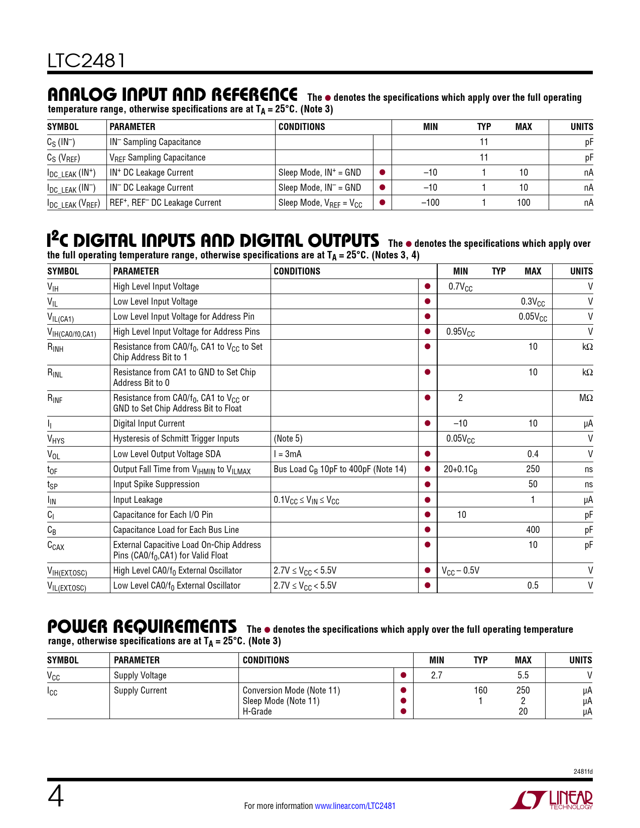 LTC2481 analog inpuT anD reFerenceThe l denotes the specifications which apply over the full operatingtemperature range, otherwise specifications are at TA = 25°C. (Note 3)SYMBOLPARAMETERCONDITIONSMINTYPMAXUNITS CS (IN–) IN– Sampling Capacitance 11 pF CS (VREF) VREF Sampling Capacitance 11 pF IDC_LEAK (IN+) IN+ DC Leakage Current Sleep Mode, IN+ = GND l –10 1 10 nA IDC_LEAK (IN–) IN– DC Leakage Current Sleep Mode, IN– = GND l –10 1 10 nA IDC_LEAK (VREF) REF+, REF– DC Leakage Current Sleep Mode, VREF = VCC l –100 1 100 nA i2c DigiTal inpuTs anD DigiTal ouTpuTsThe l denotes the specifications which apply overthe full operating temperature range, otherwise specifications are at TA = 25°C. (Notes 3, 4) SYMBOLPARAMETERCONDITIONSMINTYPMAXUNITS VIH High Level Input Voltage l 0.7VCC V VIL Low Level Input Voltage l 0.3VCC V VIL(CA1) Low Level Input Voltage for Address Pin l 0.05VCC V VIH(CA0/f0,CA1) High Level Input Voltage for Address Pins l 0.95VCC V RINH Resistance from CA0/f0, CA1 to VCC to Set l 10 kΩ Chip Address Bit to 1 RINL Resistance from CA1 to GND to Set Chip l 10 kΩ Address Bit to 0 RINF Resistance from CA0/f0, CA1 to VCC or l 2 MΩ GND to Set Chip Address Bit to Float II Digital Input Current l –10 10 µA VHYS Hysteresis of Schmitt Trig ger Inputs (Note 5) 0.05VCC V VOL Low Level Output Voltage SDA I = 3mA l 0.4 V tOF Output Fall Time from VIHMIN to VILMAX Bus Load CB 10pF to 400pF (Note 14) l 20+0.1CB 250 ns tSP Input Spike Suppression l 50 ns IIN Input Leakage 0.1VCC ≤ VIN ≤ VCC l 1 µA CI Capacitance for Each I/O Pin l 10 pF CB Capacitance Load for Each Bus Line l 400 pF CCAX External Capacitive Load On-Chip Address l 10 pF Pins (CA0/f0,CA1) for Valid Float VIH(EXT,OSC) High Level CA0/f0 External Oscillator 2.7V ≤ VCC < 5.5V l VCC – 0.5V V VIL(EXT,OSC) Low Level CA0/f0 External Oscillator 2.7V ≤ VCC < 5.5V l 0.5 V power requireMenTsThe l denotes the specifications which apply over the full operating temperaturerange, otherwise specifications are at TA = 25°C. (Note 3)SYMBOLPARAMETERCONDITIONSMINTYPMAXUNITS VCC Supply Voltage l 2.7 5.5 V ICC Supply Current Conversion Mode (Note 11) l 160 250 µA Sleep Mode (Note 11) l 1 2 µA H-Grade l 20 µA 2481fd 4 For more information www.linear.com/LTC2481 Document Outline Features Applications Description Typical Application Absolute Maximum Ratings Pin Configuration Order Information Electrical Characteristics (Normal Speed) Electrical Characteristics (2x Speed) Converter Characteristics Analog Input and Reference I2C Digital Inputs and Digital Outputs Power Requirements Timing Characteristics I2C Timing Characteristics Typical Performance Characteristics Pin Functions Functional Block Diagram Applications Information Package Description Revision History Typical Application