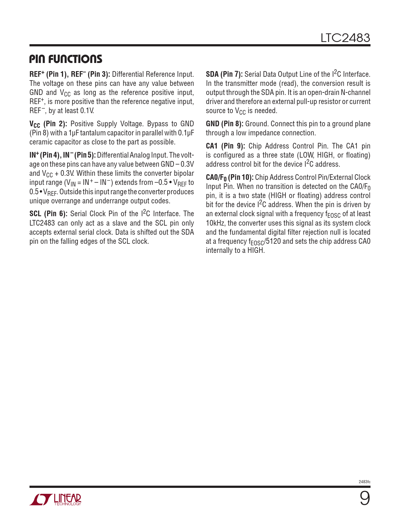 LTC2483 pin FuncTions REF+ (Pin 1), REF– (Pin 3): Differential Reference Input. SDA (Pin 7): Serial Data Output Line of the I2C Interface. The voltage on these pins can have any value between In the transmitter mode (read), the conversion result is GND and VCC as long as the reference positive input, output through the SDA pin. It is an open-drain N-channel REF+, is more positive than the reference negative input, driver and therefore an external pull-up resistor or current REF–, by at least 0.1V. source to VCC is needed. VCC (Pin 2): Positive Supply Voltage. Bypass to GND GND (Pin 8): Ground. Connect this pin to a ground plane (Pin 8) with a 1µF tantalum capacitor in parallel with 0.1µF through a low impedance connection. ceramic capacitor as close to the part as possible. CA1 (Pin 9): Chip Address Control Pin. The CA1 pin IN+ (Pin 4), IN– (Pin 5): Differential Analog Input. The volt- is configured as a three state (LOW, HIGH, or floating) age on these pins can have any value between GND – 0.3V address control bit for the device I2C address. and VCC + 0.3V. Within these limits the converter bipolar CA0/F input range (V 0 (Pin 10): Chip Address Control Pin/External Clock IN = IN+ – IN–) extends from –0.5 • VREF to Input Pin. When no transition is detected on the CA0/F 0.5 • V 0 REF. Outside this input range the converter produces pin, it is a two state (HIGH or floating) address control unique overrange and underrange output codes. bit for the device I2C address. When the pin is driven by SCL (Pin 6): Serial Clock Pin of the I2C Interface. The an external clock signal with a frequency fEOSC of at least LTC2483 can only act as a slave and the SCL pin only 10kHz, the converter uses this signal as its system clock accepts external serial clock. Data is shifted out the SDA and the fundamental digital filter rejection null is located pin on the falling edges of the SCL clock. at a frequency fEOSC/5120 and sets the chip address CA0 internally to a HIGH. 2483fc Document Outline Features Applications Description Absolute Maximum Ratings Pin Configuration Order Information Electrical Characteristics Converter Characteristics Analog Input and Reference I2C Digital Inputs and Digital Outputs Power Requirements Timing Characteristics I2C Timing Characteristics Typical Performance Characteristics Pin Functions Block Diagram Applications Information Package Description Revision History Typical Application Related Parts