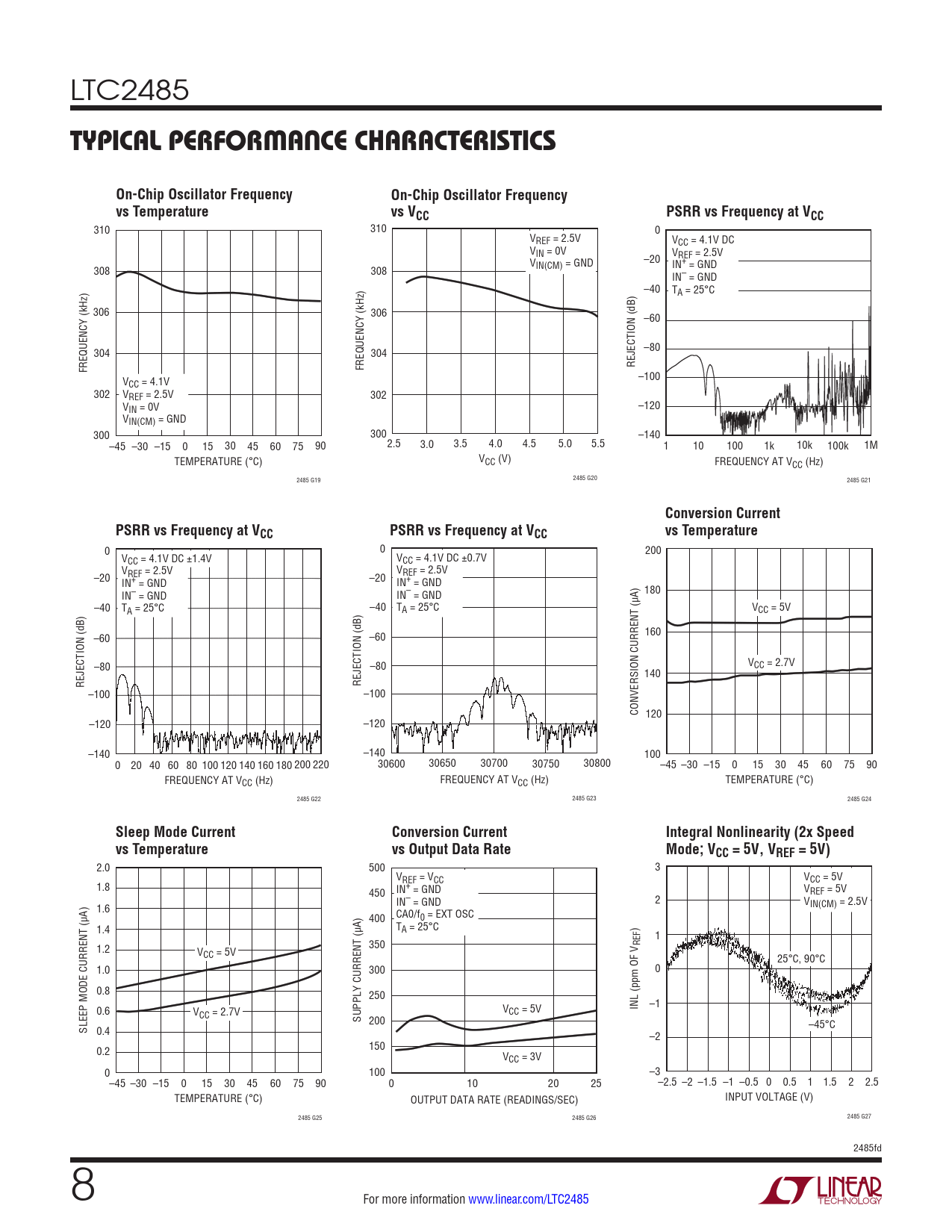 310 310 0 VREF = 2.5V VCC = 4.1V DC VIN = 0V VREF = 2.5V V –20 IN+ = GND 308 308 IN(CM) = GND IN– = GND –40 TA = 25°C 306 306 –60 304 304 –80 FREQUENCY (kHz) FREQUENCY (kHz) REJECTION (dB) V –100 CC = 4.1V 302 VREF = 2.5V 302 VIN = 0V –120 VIN(CM) = GND 300 300 –140 –45 –30 –15 0 15 30 45 60 75 90 2.5 3.0 3.5 4.0 4.5 5.0 5.5 1 10 100 1k 10k 100k 1M TEMPERATURE (°C) VCC (V) FREQUENCY AT VCC (Hz) 2485 G19 2485 G20 2485 G21