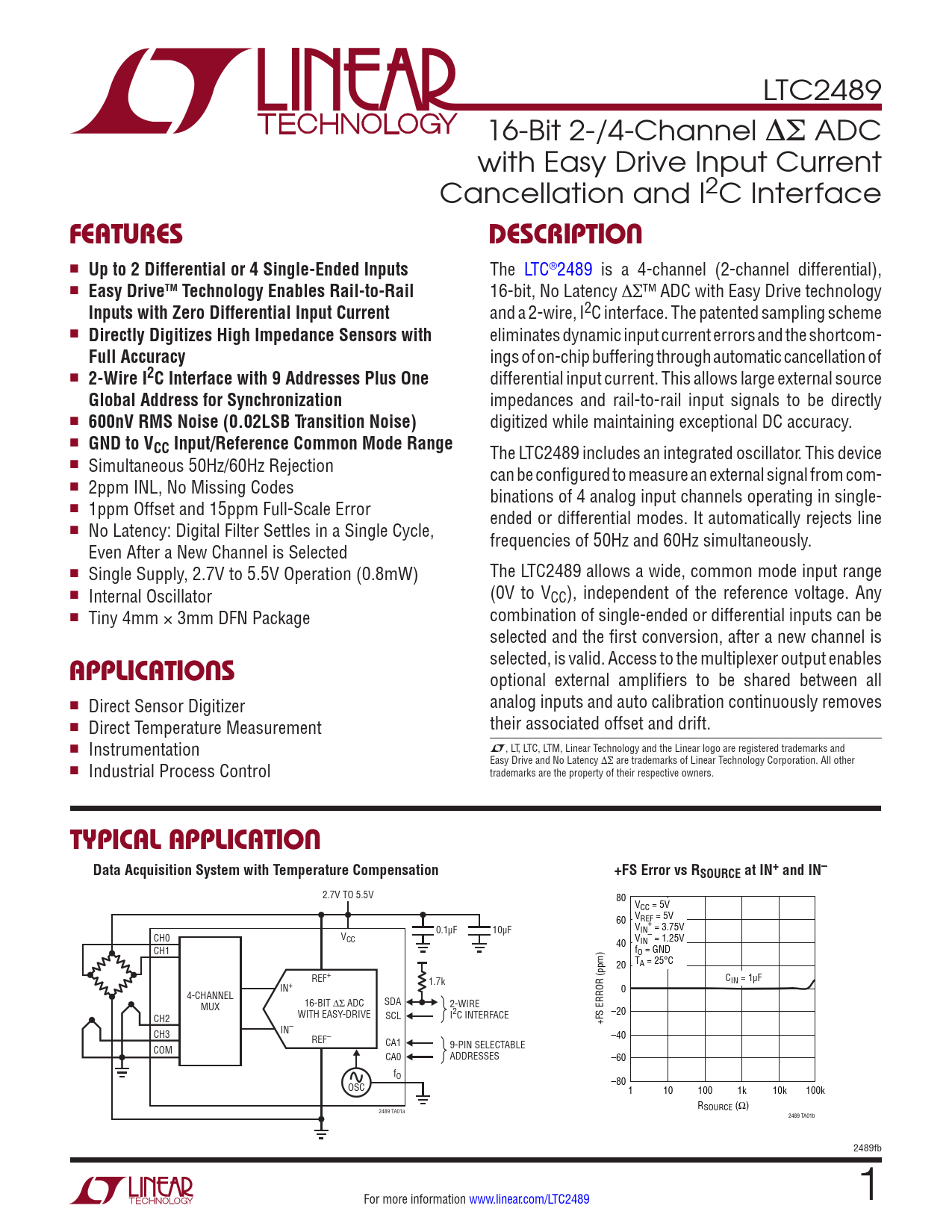 LTC2489 16-Bit 2-/4-Channel DΣ ADC with Easy Drive Input Current Cancellation and I2C Interface FeaTuresDescripTion n Up to 2 Differential or 4 Single-Ended Inputs The LTC®2489 is a 4-channel (2-channel differential), n Easy DriveTM Technology Enables Rail-to-Rail 16-bit, No Latency DΣ™ ADC with Easy Drive technology Inputs with Zero Differential Input Current and a 2-wire, I2C interface. The patented sampling scheme n Directly Digitizes High Impedance Sensors with eliminates dynamic input current errors and the shortcom- Full Accuracy ings of on-chip buffering through automatic cancellation of n 2-Wire I2C Interface with 9 Addresses Plus One differential input current. This allows large external source Global Address for Synchronization impedances and rail-to-rail input signals to be directly n 600nV RMS Noise (0.02LSB Transition Noise) digitized while maintaining exceptional DC accuracy. n GND to VCC Input/Reference Common Mode Range The LTC2489 includes an integrated oscillator. This device n Simultaneous 50Hz/60Hz Rejection can be configured to measure an external signal from com- n 2ppm INL, No Missing Codes binations of 4 analog input channels operating in single- n 1ppm Offset and 15ppm Full-Scale Error ended or differential modes. It automatically rejects line n No Latency: Digital Filter Settles in a Single Cycle, frequencies of 50Hz and 60Hz simultaneously. Even After a New Channel is Selected n Single Supply, 2.7V to 5.5V Operation (0.8mW) The LTC2489 allows a wide, common mode input range n Internal Oscillator (0V to VCC), independent of the reference voltage. Any n Tiny 4mm × 3mm DFN Package combination of single-ended or differential inputs can be selected and the first conversion, after a new channel is applicaTions selected, is valid. Access to the multiplexer output enables optional external amplifiers to be shared between all n Direct Sensor Digitizer analog inputs and auto calibration continuously removes n Direct Temperature Measurement their associated offset and drift. n L, LT, LTC, LTM, Linear Technology and the Linear logo are registered trademarks and Instrumentation Easy Drive and No Latency DΣ are trademarks of Linear Technology Corporation. All other n Industrial Process Control trademarks are the property of their respective owners. Typical applicaTionData Acquisition System with Temperature Compensation+FS Error vs RSOURCE at IN+ and IN– 2.7V TO 5.5V 80 VCC = 5V 60 VREF = 5V + 0.1µF 10µF VIN = 3.75V CH0 VCC – 40 VIN = 1.25V CH1 fO = GND 20 TA = 25°C REF+ 1.7k CIN = 1µF IN+ 0 4-CHANNEL 16-BIT ∆Σ ADC SDA MUX 2-WIRE WITH EASY-DRIVE SCL I2C INTERFACE –20 CH2 +FS ERROR (ppm) IN– CH3 REF– –40 CA1 COM 9-PIN SELECTABLE CA0 ADDRESSES –60 fO –80 OSC 1 10 100 1k 10k 100k RSOURCE (Ω) 2489 TA01a 2489 TA01b 2489fb For more information www.linear.com/LTC2489 1 Document Outline Features Applications Typical Application Description Absolute Maximum Ratings Order Information Pin Configuration Electrical Characteristics Converter Characteristics Analog Input and Reference I2C Inputs and Digital Outputs Power Requirements Digital Inputs and Digital Outputs I2C Timing Characteristics Typical Performance Characteristics Pin Functions Functional Block Diagram Applications Information Package Description Revision History Typical Application Related Parts
