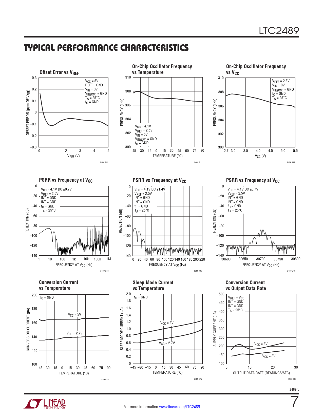 0.3 310 310 VCC = 5V VREF = 2.5V REF– = GND VIN = 0V ) 0.2 VIN = 0V 308 V 308 IN(CM) = GND REF VIN(CM) = GND fO = GND TA = 25°C TA = 25°C 0.1 fO = GND 306 306 0 304 304 –0.1 FREQUENCY (kHz) V FREQUENCY (kHz) CC = 4.1V VREF = 2.5V OFFSET ERROR (ppm OF V 302 –0.2 VIN = 0V 302 VIN(CM) = GND fO = GND –0.3 300 300 0 1 2 3 4 5 –45 –30 –15 0 15 30 45 60 75 90 2.7 3.0 3.5 4.0 4.5 5.0 5.5 VREF (V) TEMPERATURE (°C) VCC (V) 2489 G10 2489 G11 2489 G12