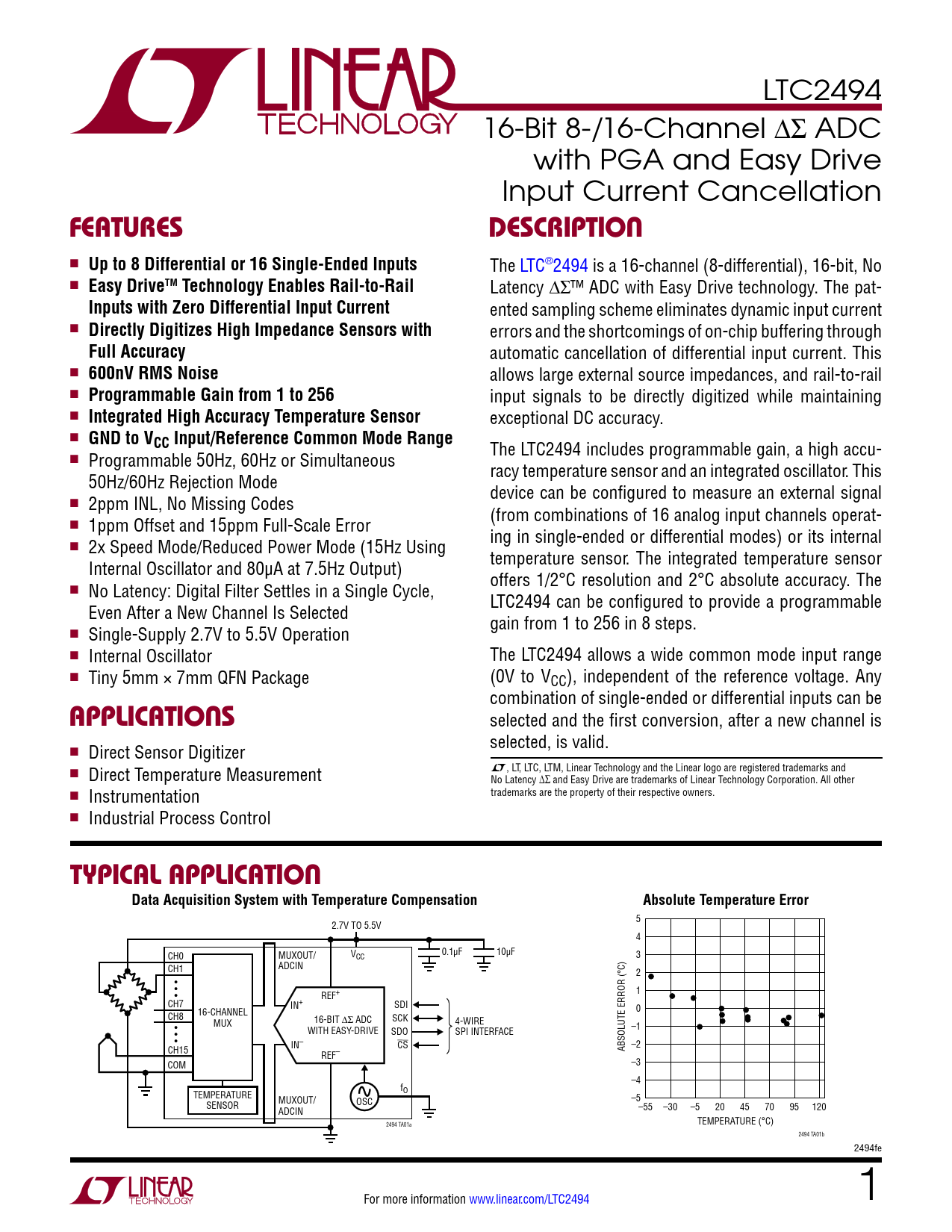LTC2494 16-Bit 8-/16-Channel DS ADC with PGA and Easy Drive Input Current Cancellation FeaturesDescription n Up to 8 Differential or 16 Single-Ended Inputs The LTC®2494 is a 16-channel (8-differential), 16-bit, No n Easy DriveTM Technology Enables Rail-to-Rail Latency DS™ ADC with Easy Drive technology. The pat- Inputs with Zero Differential Input Current ented sampling scheme eliminates dynamic input current n Directly Digitizes High Impedance Sensors with errors and the shortcomings of on-chip buffering through Full Accuracy automatic cancellation of differential input current. This n 600nV RMS Noise allows large external source impedances, and rail-to-rail n Programmable Gain from 1 to 256 input signals to be directly digitized while maintaining n Integrated High Accuracy Temperature Sensor exceptional DC accuracy. n GND to VCC Input/Reference Common Mode Range The LTC2494 includes programmable gain, a high accu- n Programmable 50Hz, 60Hz or Simultaneous racy temperature sensor and an integrated oscillator. This 50Hz/60Hz Rejection Mode device can be configured to measure an external signal n 2ppm INL, No Missing Codes (from combinations of 16 analog input channels operat- n 1ppm Offset and 15ppm Full-Scale Error ing in single-ended or differential modes) or its internal n 2x Speed Mode/Reduced Power Mode (15Hz Using temperature sensor. The integrated temperature sensor Internal Oscillator and 80µA at 7.5Hz Output) offers 1/2°C resolution and 2°C absolute accuracy. The n No Latency: Digital Filter Settles in a Single Cycle, LTC2494 can be configured to provide a programmable Even After a New Channel Is Selected gain from 1 to 256 in 8 steps. n Single-Supply 2.7V to 5.5V Operation n Internal Oscillator The LTC2494 allows a wide common mode input range n Tiny 5mm × 7mm QFN Package (0V to VCC), independent of the reference voltage. Any combination of single-ended or differential inputs can be applications selected and the first conversion, after a new channel is selected, is valid. n Direct Sensor Digitizer L, LT, LTC, LTM, Linear Technology and the Linear logo are registered trademarks and n Direct Temperature Measurement No Latency ∆∑ and Easy Drive are trademarks of Linear Technology Corporation. All other n Instrumentation trademarks are the property of their respective owners. n Industrial Process Control typical applicationData Acquisition System with Temperature CompensationAbsolute Temperature Error 5 2.7V TO 5.5V 4 CH0 MUXOUT/ VCC 0.1µF 10µF 3 ADCIN CH1 2 • • • REF+ 1 CH7 IN+ SDI 16-CHANNEL 0 CH8 16-BIT ∆Σ ADC SCK MUX 4-WIRE • WITH EASY-DRIVE SDO SPI INTERFACE –1 • • IN– CS –2 CH15 ABSOLUTE ERROR (°C) REF– COM –3 –4 fO TEMPERATURE MUXOUT/ –5 SENSOR OSC ADCIN –55 –30 –5 20 45 70 95 120 TEMPERATURE (°C) 2494 TA01a 2494 TA01b 2494fe For more information www.linear.com/LTC2494 1