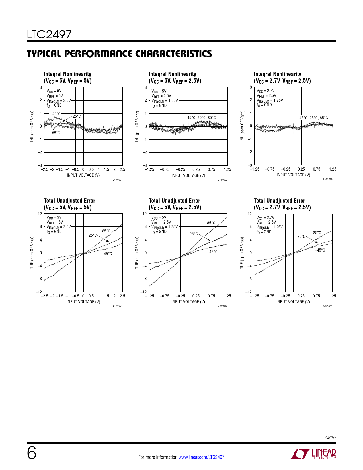 3 3 3 VCC = 5V VCC = 5V VCC = 2.7V VREF = 5V VREF = 2.5V VREF = 2.5V 2 VIN(CM) = 2.5V 2 VIN(CM) = 1.25V 2 VIN(CM) = 1.25V fO = GND fO = GND fO = GND ) 1 –45°C 1 1 REF 25°C REF –45°C, 25°C, 85°C REF –45°C, 25°C, 85°C 0 0 0 85°C INL (ppm OF V –1 INL (ppm OF V –1 INL (ppm OF V –1 –2 –2 –2 –3 –3 –3 –2.5 –2 –1.5 –1 –0.5 0 0.5 1 1.5 2 2.5 –1.25 –0.75 –0.25 0.25 0.75 1.25 –1.25 –0.75 –0.25 0.25 0.75 1.25 INPUT VOLTAGE (V) INPUT VOLTAGE (V) INPUT VOLTAGE (V) 2497 G01 2497 G02 2497 G03