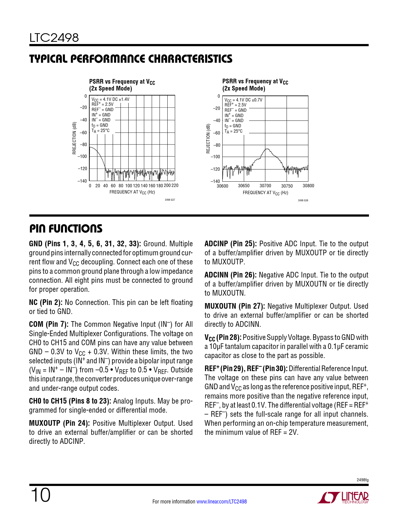 LTC2498 typical perForMance characteristicsPSRR vs Frequency at VCCPSRR vs Frequency at VCC(2x Speed Mode)(2x Speed Mode) 0 0 VCC = 4.1V DC ±1.4V VCC = 4.1V DC ±0.7V REF+ = 2.5V –20 REF+ = 2.5V REF– = GND –20 REF– = GND IN+ = GND IN+ = GND –40 IN– = GND –40 IN– = GND fO = GND fO = GND –60 TA = 25°C –60 TA = 25°C –80 –80 RREJECTION (dB) REJECTION (dB) –100 –100 –120 –120 –140 –140 0 20 40 60 80 100 120 140 160 180 200 220 30600 30650 30700 30750 30800 FREQUENCY AT VCC (Hz) FREQUENCY AT VCC (Hz) 2498 G37 2498 G38 pin FunctionsGND (Pins 1, 3, 4, 5, 6, 31, 32, 33): Ground. Multiple ADCINP (Pin 25): Positive ADC Input. Tie to the output ground pins internally connected for optimum ground cur- of a buffer/amplifier driven by MUXOUTP or tie directly rent flow and VCC decoupling. Connect each one of these to MUXOUTP. pins to a common ground plane through a low impedance ADCINN (Pin 26): Negative ADC Input. Tie to the output connection. All eight pins must be connected to ground of a buffer/amplifier driven by MUXOUTN or tie directly for proper operation. to MUXOUTN. NC (Pin 2): No Connection. This pin can be left floating MUXOUTN (Pin 27): Negative Multiplexer Output. Used or tied to GND. to drive an external buffer/amplifier or can be shorted COM (Pin 7): The Common Negative Input (IN–) for All directly to ADCINN. Single-Ended Multiplexer Configurations. The voltage on V CH0 to CH15 and COM pins can have any value between CC (Pin 28): Positive Supply Voltage. Bypass to GND with a 10µF tantalum capacitor in parallel with a 0.1µF ceramic GND – 0.3V to VCC + 0.3V. Within these limits, the two capacitor as close to the part as possible. selected inputs (IN+ and IN–) provide a bipolar input range (VIN = IN+ – IN–) from –0.5 • VREF to 0.5 • VREF. Outside REF+ (Pin 29), REF– (Pin 30): Differential Reference Input. this input range, the converter produces unique over-range The voltage on these pins can have any value between and under-range output codes. GND and VCC as long as the reference positive input, REF+, remains more positive than the negative reference input, CH0 to CH15 (Pins 8 to 23): Analog Inputs. May be pro- REF–, by at least 0.1V. The differential voltage (REF = REF+ grammed for single-ended or differential mode. – REF–) sets the full-scale range for all input channels. MUXOUTP (Pin 24): Positive Multiplexer Output. Used When performing an on-chip temperature measurement, to drive an external buffer/amplifier or can be shorted the minimum value of REF = 2V. directly to ADCINP. 2498fg 10 For more information www.linear.com/LTC2498 Document Outline Features Description Applications Typical Application Absolute Maximum Ratings Pin Configuration Order Information Electrical Characteristics (Normal Speed) Electrical Characteristics (2x Speed) Converter Characteristics Analog Input and Reference Digital Inputs and Digital Outputs Power Requirements Digital Inputs and Digital Outputs Typical Performance Characteristics Pin Functions Functional Block Diagram Test Circuits Timing Diagrams Applications Information Package Description Revision History Related Parts