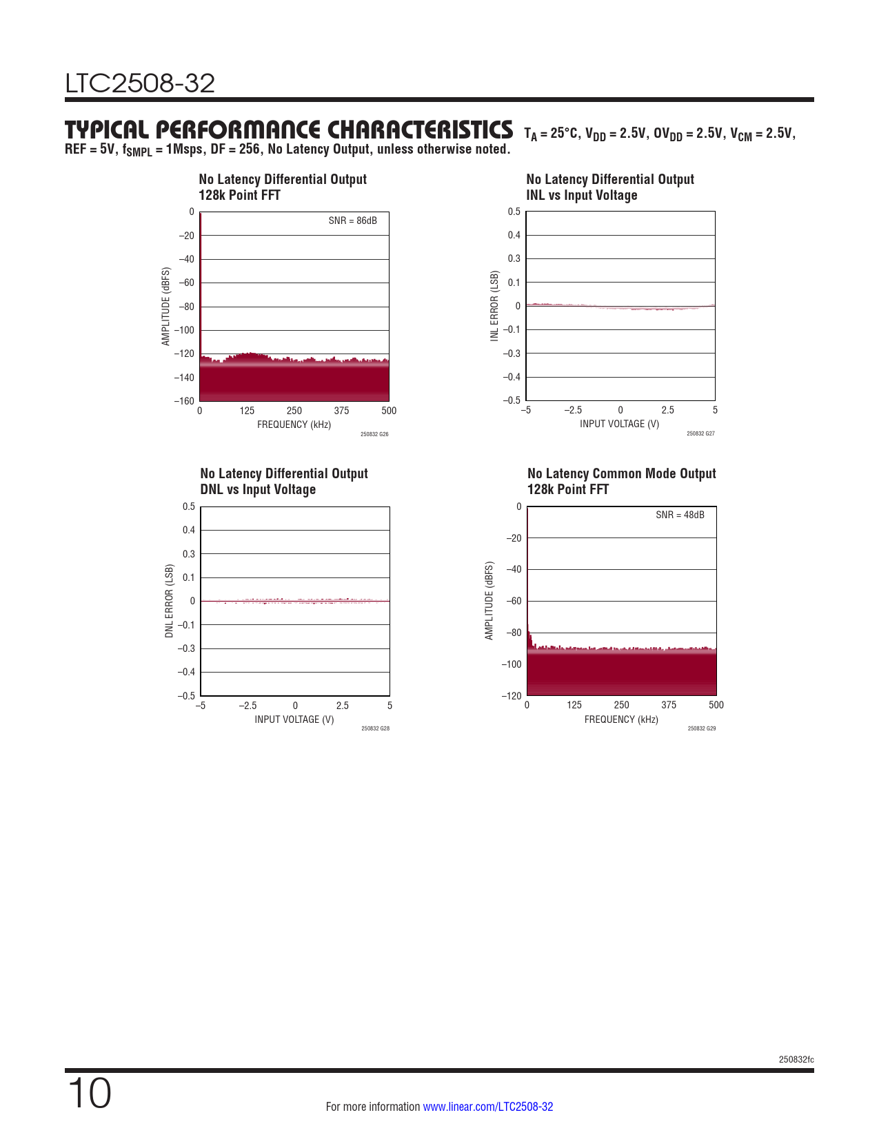 0.5 0 SNR = 48dB 0.4 –20 0.3 –40 0.1 0 –60 –0.1 DNL ERROR (LSB) –80 AMPLITUDE (dBFS) –0.3 –100 –0.4 –0.5 –120 –5 –2.5 0 2.5 5 0 125 250 375 500 INPUT VOLTAGE (V) FREQUENCY (kHz) 250832 G28 250832 G29 250832fc 10 For more information www.linear.com/LTC2508-32