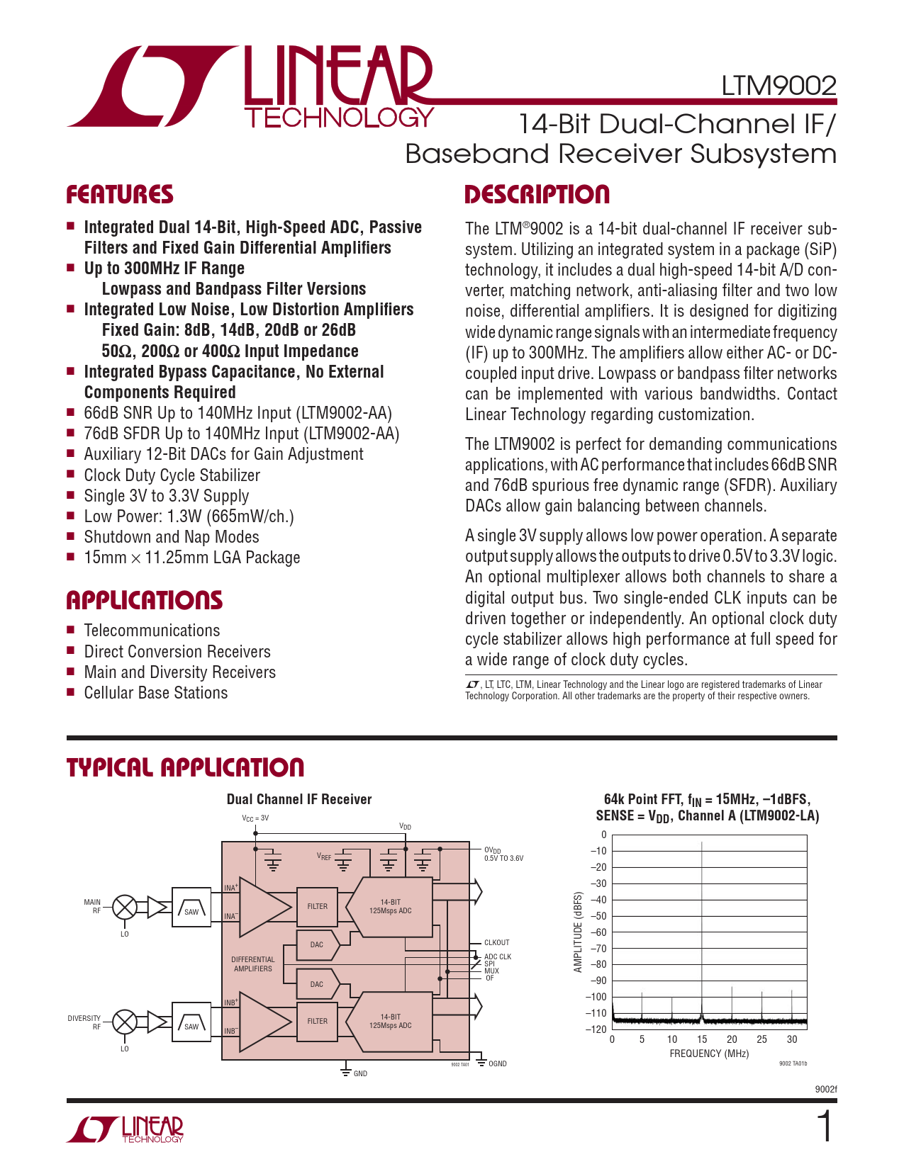 LTM9002 14-Bit Dual-Channel IF/ Baseband Receiver Subsystem FEATURESDESCRIPTION n Integrated Dual 14-Bit, High-Speed ADC, Passive The LTM®9002 is a 14-bit dual-channel IF receiver sub- Filters and Fixed Gain Differential Amplifi ers system. Utilizing an integrated system in a package (SiP) n Up to 300MHz IF Range technology, it includes a dual high-speed 14-bit A/D con- Lowpass and Bandpass Filter Versions verter, matching network, anti-aliasing fi lter and two low n Integrated Low Noise, Low Distortion Amplifi ers noise, differential amplifi ers. It is designed for digitizing Fixed Gain: 8dB, 14dB, 20dB or 26dB wide dynamic range signals with an intermediate frequency 50Ω, 200Ω or 400Ω Input Impedance (IF) up to 300MHz. The amplifi ers allow either AC- or DC- n Integrated Bypass Capacitance, No External coupled input drive. Lowpass or bandpass fi lter networks Components Required can be implemented with various bandwidths. Contact n 66dB SNR Up to 140MHz Input (LTM9002-AA) Linear Technology regarding customization. n 76dB SFDR Up to 140MHz Input (LTM9002-AA) The LTM9002 is perfect for demanding communications n Auxiliary 12-Bit DACs for Gain Adjustment applications, with AC performance that includes 66dB SNR n Clock Duty Cycle Stabilizer and 76dB spurious free dynamic range (SFDR). Auxiliary n Single 3V to 3.3V Supply DACs allow gain balancing between channels. n Low Power: 1.3W (665mW/ch.) n Shutdown and Nap Modes A single 3V supply allows low power operation. A separate n 15mm × 11.25mm LGA Package output supply allows the outputs to drive 0.5V to 3.3V logic. An optional multiplexer allows both channels to share a APPLICATIONS digital output bus. Two single-ended CLK inputs can be driven together or independently. An optional clock duty n Telecommunications cycle stabilizer allows high performance at full speed for n Direct Conversion Receivers a wide range of clock duty cycles. n Main and Diversity Receivers L n , LT, LTC, LTM, Linear Technology and the Linear logo are registered trademarks of Linear Cellular Base Stations Technology Corporation. All other trademarks are the property of their respective owners. TYPICAL APPLICATIONDual Channel IF Receiver64k Point FFT, fIN = 15MHz, –1dBFS, V SENSE = V CC = 3V DD, Channel A (LTM9002-LA) VDD 0 OVDD –10 VREF 0.5V TO 3.6V –20 –30 INA+ MAIN 14-BIT –40 FILTER RF SAW 125Msps ADC INA– –50 LO –60 CLKOUT DAC –70 DIFFERENTIAL ADC CLK SPI AMPLIFIERS –80 MUX AMPLITUDE (dBFS) OF DAC –90 –100 INB+ –110 DIVERSITY 14-BIT FILTER RF SAW 125Msps ADC INB– –120 0 5 10 15 20 25 30 LO FREQUENCY (MHz) 9002 TA01 OGND 9002 TA01b GND 9002f 1