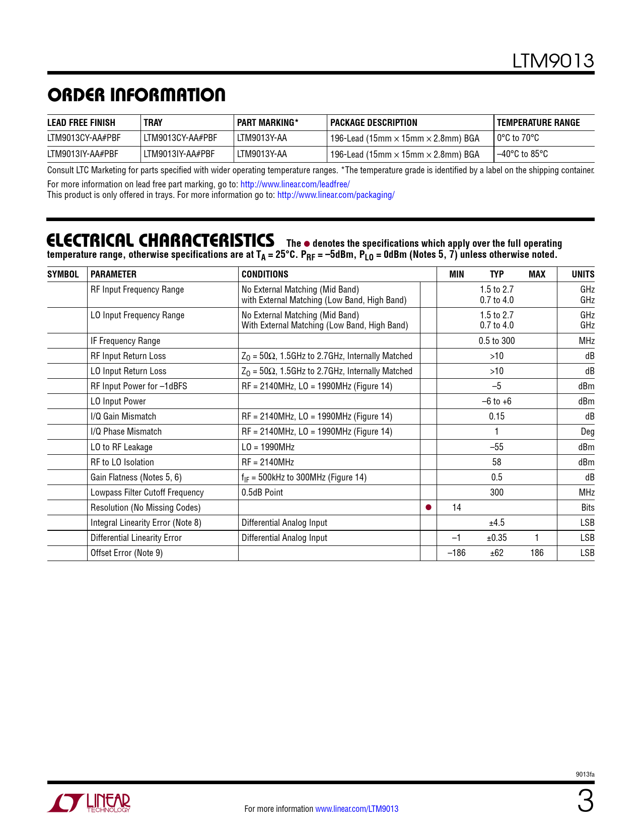 LTM9013CY-AA#PBF LTM9013CY-AA#PBF LTM9013Y-AA 196-Lead (15mm × 15mm × 2.8mm) BGA 0°C to 70°C LTM9013IY-AA#PBF LTM9013IY-AA#PBF LTM9013Y-AA 196-Lead (15mm × 15mm × 2.8mm) BGA –40°C to 85°C Consult LTC Marketing for parts specified with wider operating temperature ranges. *The temperature grade is identified by a label on the shipping container. For more information on lead free part marking, go to: http://www.linear.com/leadfree/ This product is only offered in trays. For more information go to: http://www.linear.com/packaging/