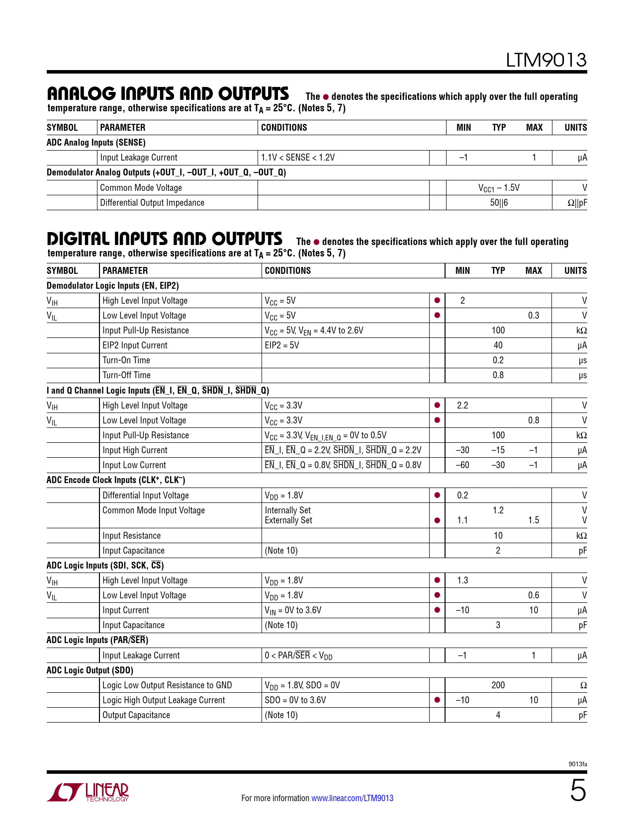 LTM9013 analogainalog npuiTnpu s anTDs anD ouo Tu puT Tpu sTThe l denotes the specifications which apply over the full operatingtemperature range, otherwise specifications are at TA = 25°C. (Notes 5, 7)SYMBOLPARAMETERCONDITIONSMINTYPMAXUNITSADC Analog Inputs (SENSE) Input Leakage Current 1.1V < SENSE < 1.2V –1 1 μA Demodulator Analog Outputs (+OUT_I, –OUT_I, +OUT_Q, –OUT_Q) Common Mode Voltage VCC1 – 1.5V V Differential Output Impedance 50||6 Ω||pF DigiTal inpuTs anD ouTpuTsThe l denotes the specifications which apply over the full operatingtemperature range, otherwise specifications are at TA = 25°C. (Notes 5, 7)SYMBOLPARAMETERCONDITIONSMINTYPMAXUNITSDemodulator Logic Inputs (EN, EIP2) VIH High Level Input Voltage VCC = 5V l 2 V VIL Low Level Input Voltage VCC = 5V l 0.3 V Input Pull-Up Resistance VCC = 5V, VEN = 4.4V to 2.6V 100 kΩ EIP2 Input Current EIP2 = 5V 40 μA Turn-On Time 0.2 µs Turn-Off Time 0.8 µs I and Q Channel Logic Inputs (EN_I, EN_Q, SHDN_I, SHDN_Q) VIH High Level Input Voltage VCC = 3.3V l 2.2 V VIL Low Level Input Voltage VCC = 3.3V l 0.8 V Input Pull-Up Resistance VCC = 3.3V, VEN_I,EN_Q = 0V to 0.5V 100 kΩ Input High Current EN_I, EN_Q = 2.2V, SHDN_I, SHDN_Q = 2.2V –30 –15 –1 µA Input Low Current EN_I, EN_Q = 0.8V, SHDN_I, SHDN_Q = 0.8V –60 –30 –1 µA ADC Encode Clock Inputs (CLK+, CLK–) Differential Input Voltage VDD = 1.8V l 0.2 V Common Mode Input Voltage Internally Set 1.2 V Externally Set l 1.1 1.5 V Input Resistance 10 kΩ Input Capacitance (Note 10) 2 pF ADC Logic Inputs (SDI, SCK, CS) VIH High Level Input Voltage VDD = 1.8V l 1.3 V VIL Low Level Input Voltage VDD = 1.8V l 0.6 V Input Current VIN = 0V to 3.6V l –10 10 μA Input Capacitance (Note 10) 3 pF ADC Logic Inputs (PAR/SER) Input Leakage Current 0 < PAR/SER < VDD –1 1 μA ADC Logic Output (SDO) Logic Low Output Resistance to GND VDD = 1.8V, SDO = 0V 200 Ω Logic High Output Leakage Current SDO = 0V to 3.6V l –10 10 µA Output Capacitance (Note 10) 4 pF 9013fa For more information www.linear.com/LTM9013 5 Document Outline Features Applications Description Typical Application Absolute Maximum Ratings Pin Configuration Order Information Electrical Characteristics Dynamic Accuracy Analog Inputs and Outputs Digital Inputs and Outputs Power Requirements Timing Characteristics Typical Performance Characteristics Pin Functions Block Diagram Timing Diagrams Operation Applications Information Typical Applications Package Description Revision History Typical Application Related Parts