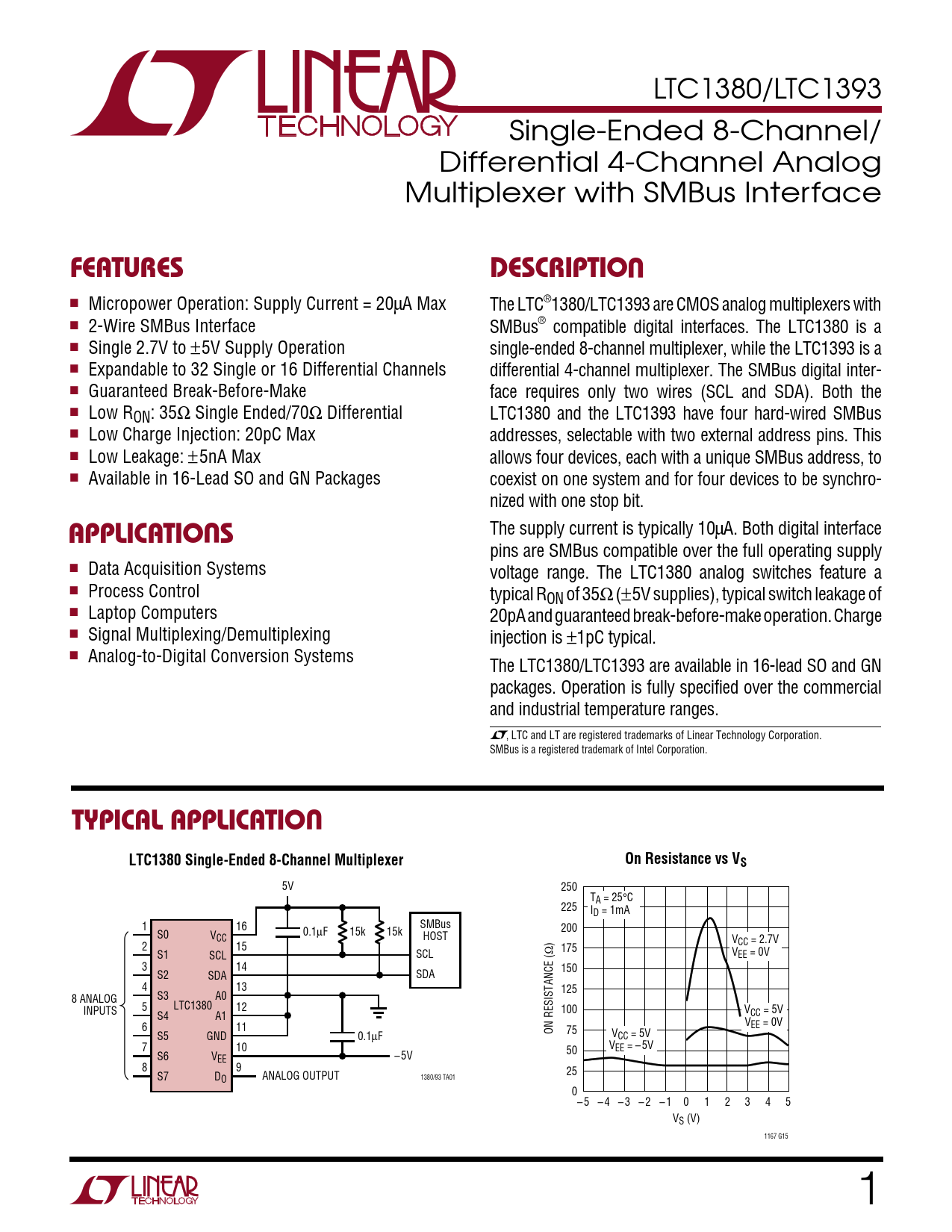 LTC1380/LTC1393 Single-Ended 8-Channel/ Differential 4-Channel Analog Multiplexer with SMBus Interface UFEATURESDESCRIPTION ■ Micropower Operation: Supply Current = 20µA Max The LTC®1380/LTC1393 are CMOS analog multiplexers with ■ 2-Wire SMBus Interface SMBus® compatible digital interfaces. The LTC1380 is a ■ Single 2.7V to ±5V Supply Operation single-ended 8-channel multiplexer, while the LTC1393 is a ■ Expandable to 32 Single or 16 Differential Channels differential 4-channel multiplexer. The SMBus digital inter- ■ Guaranteed Break-Before-Make face requires only two wires (SCL and SDA). Both the ■ Low RON: 35Ω Single Ended/70Ω Differential LTC1380 and the LTC1393 have four hard-wired SMBus ■ Low Charge Injection: 20pC Max addresses, selectable with two external address pins. This ■ Low Leakage: ±5nA Max allows four devices, each with a unique SMBus address, to ■ Available in 16-Lead SO and GN Packages coexist on one system and for four devices to be synchro- nized with one stop bit. U The supply current is typically 10µA. Both digital interface APPLICATIONS pins are SMBus compatible over the full operating supply ■ Data Acquisition Systems voltage range. The LTC1380 analog switches feature a ■ Process Control typical RON of 35Ω (±5V supplies), typical switch leakage of ■ Laptop Computers 20pA and guaranteed break-before-make operation. Charge ■ Signal Multiplexing/Demultiplexing injection is ±1pC typical. ■ Analog-to-Digital Conversion Systems The LTC1380/LTC1393 are available in 16-lead SO and GN packages. Operation is fully specified over the commercial and industrial temperature ranges. , LTC and LT are registered trademarks of Linear Technology Corporation. SMBus is a registered trademark of Intel Corporation. UTYPICAL APPLICATIONLTC1380 Single-Ended 8-Channel MultiplexerOn Resistance vs VS 5V 250 TA = 25°C 225 ID = 1mA 1 16 SMBus 200 0.1µF 15k 15k S0 VCC HOST ) VCC = 2.7V 2 15 Ω 175 V S1 SCL SCL EE = 0V 3 14 150 S2 SDA SDA 4 13 125 8 ANALOG S3 A0 5 LTC1380 12 INPUTS 100 VCC = 5V S4 A1 VEE = 0V 6 11 ON RESISTANCE ( 75 V S5 GND 0.1µF CC = 5V V 7 10 50 EE = – 5V S6 V – 5V EE 8 9 25 S7 D ANALOG OUTPUT 1380/93 TA01 O 0–5 –4 –3 –2 –1 0 1 2 3 4 5 VS (V) 1167 G15 1