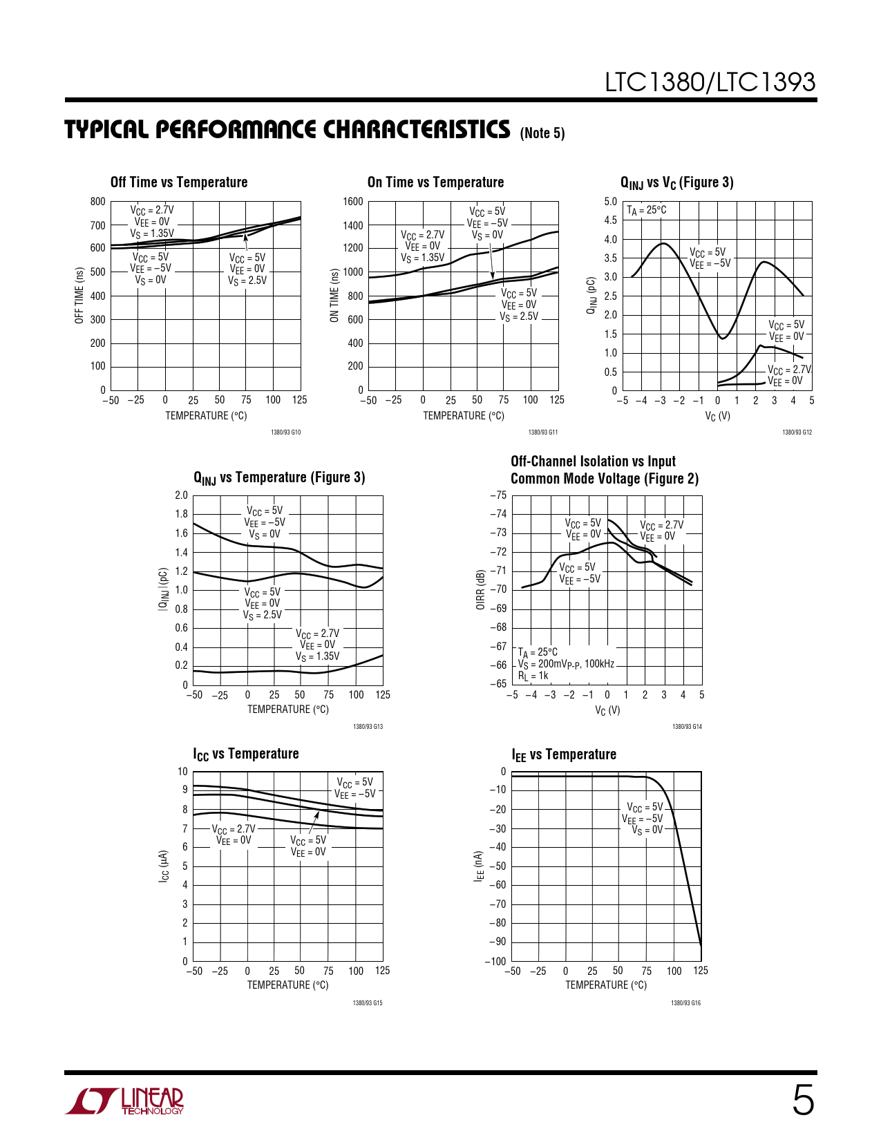 10 0 VCC = 5V 9 V –10 EE = – 5V 8 –20 VCC = 5V VEE = –5V 7 VCC = 2.7V – 30 VS = 0V VEE = 0V V 6 CC = 5V V – 40 EE = 0V µA) ( 5 (nA) – 50 I CC I EE 4 – 60 3 –70 2 – 80 1 – 90 0 –100 –50 –25 0 25 50 75 100 125 –50 –25 0 25 50 75 100 125 TEMPERATURE (°C) TEMPERATURE (°C) 1380/93 G15 1380/93 G16 5