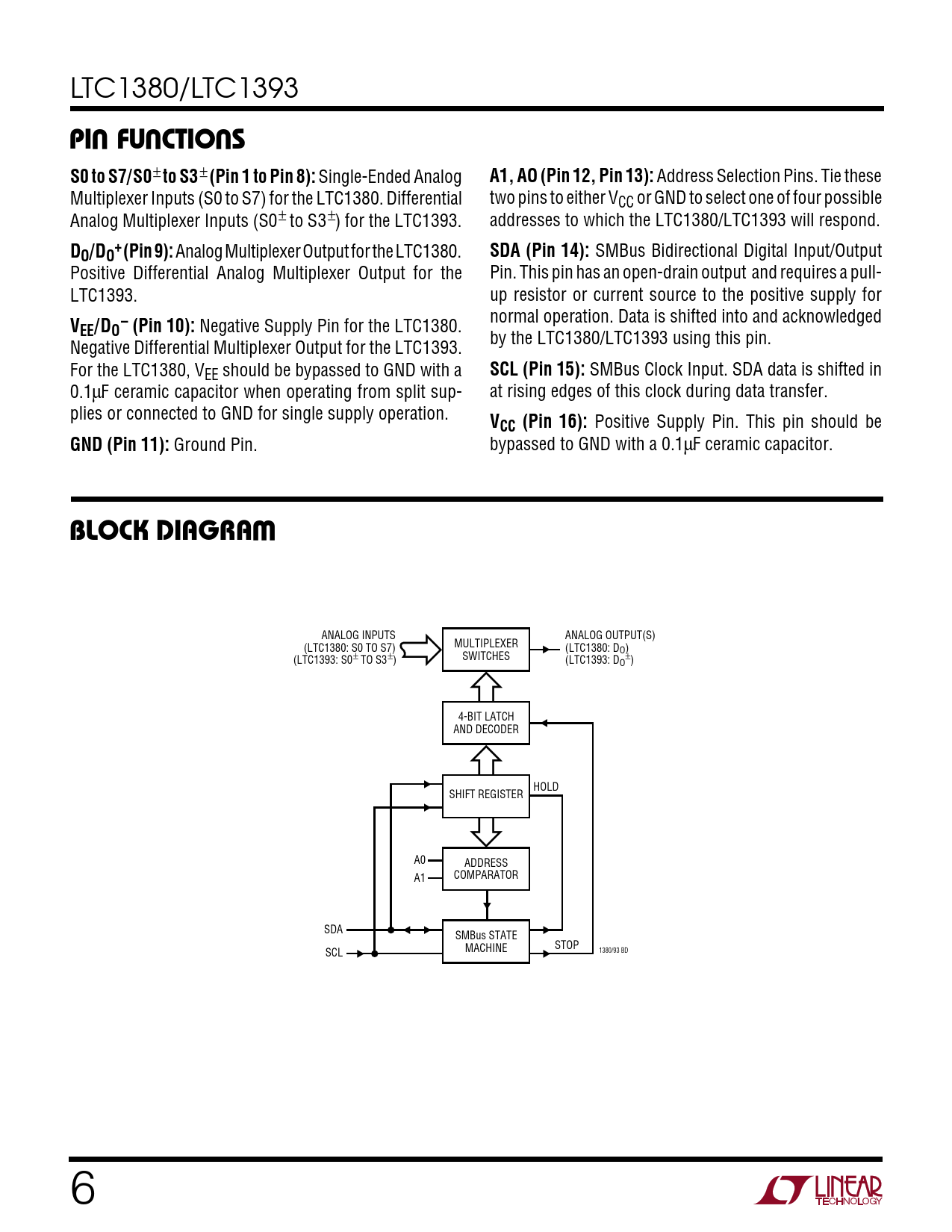 ANALOG INPUTS ANALOG OUTPUT(S) MULTIPLEXER (LTC1380: S0 TO S7) (LTC1380: DO) SWITCHES (LTC1393: S0± TO S3±) (LTC1393: D ± O ) 4-BIT LATCH AND DECODER HOLD SHIFT REGISTER A0 ADDRESS COMPARATOR A1 SDA SMBus STATE MACHINE STOP 1380/93 BD SCL 6