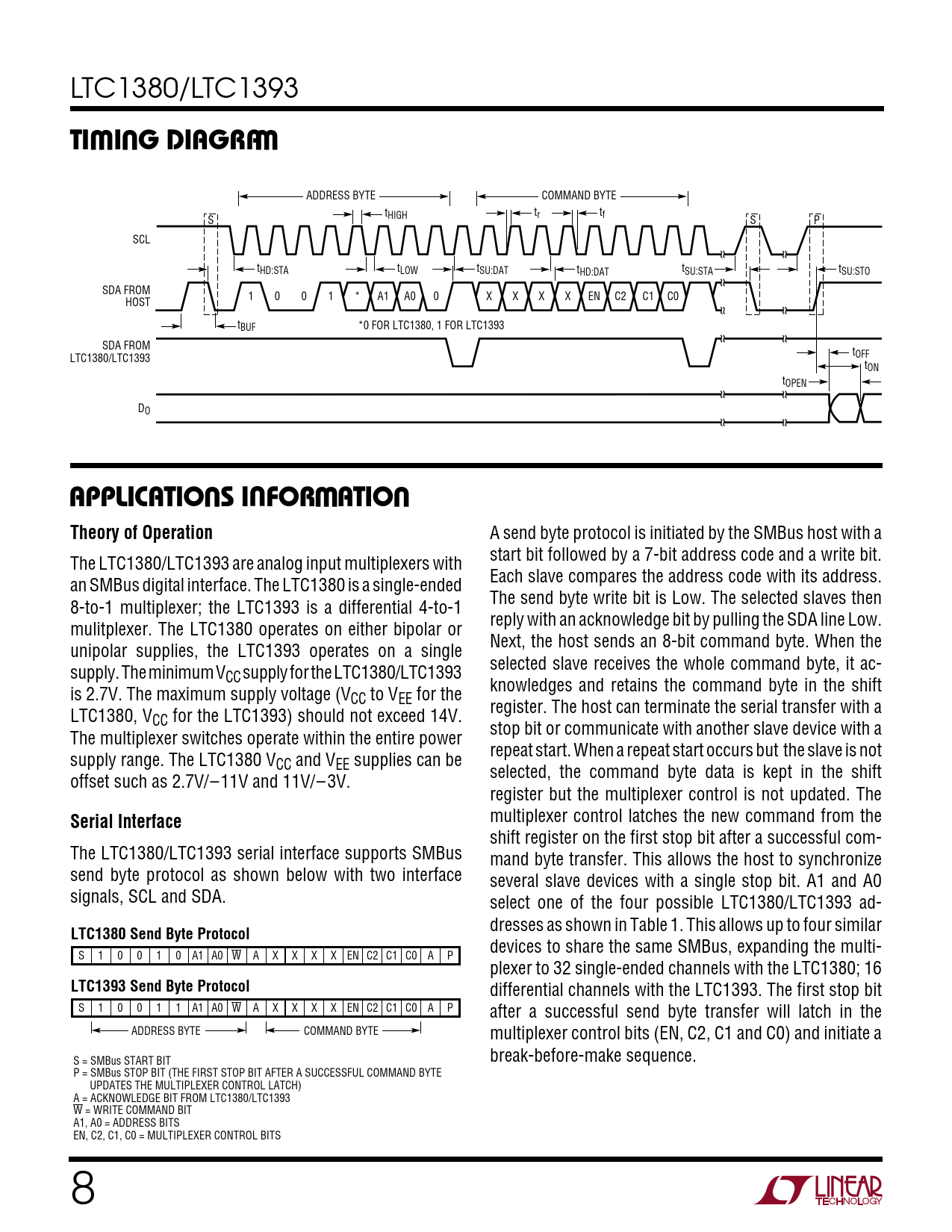 ADDRESS BYTE COMMAND BYTE t t HIGH r tf S S P SCL t t t HD:STA LOW SU:DAT t t HD:DAT SU:STA tSU:STO SDA FROM 1 0 0 1 * A1 A0 0 X X X X EN C2 C1 C0 HOST tBUF *0 FOR LTC1380, 1 FOR LTC1393 SDA FROM t LTC1380/LTC1393 OFF tON tOPEN DO