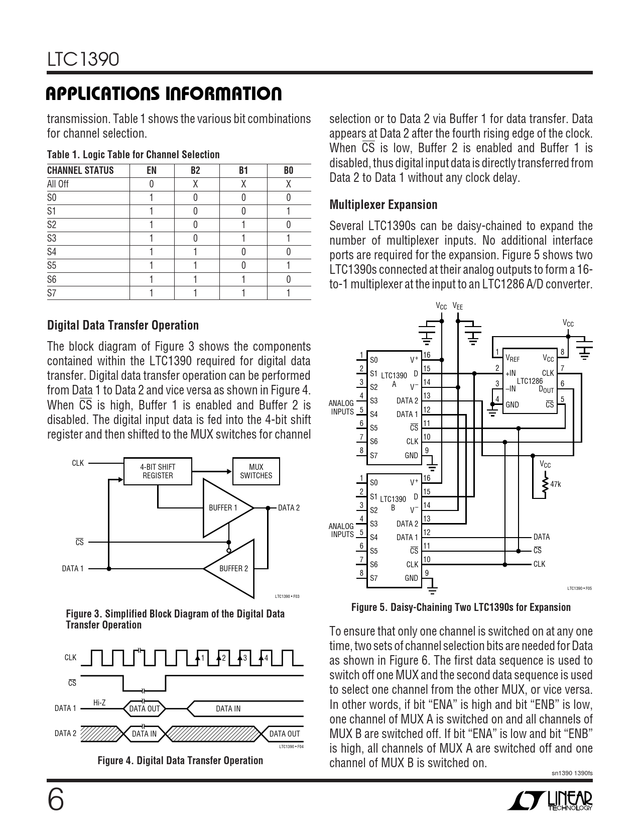 To ensure that only one channel is switched on at any one time, two sets of channel selection bits are needed for Data CLK 1 2 3 4 as shown in Figure 6. The first data sequence is used to switch off one MUX and the second data sequence is used CS to select one channel from the other MUX, or vice versa. Hi-Z In other words, if bit “ENA” is high and bit “ENB” is low, DATA 1 DATA OUT DATA IN one channel of MUX A is switched on and all channels of DATA 2 DATA IN DATA OUT MUX B are switched off. If bit “ENA” is low and bit “ENB” LTC1390 • F04 is high, all channels of MUX A are switched off and one