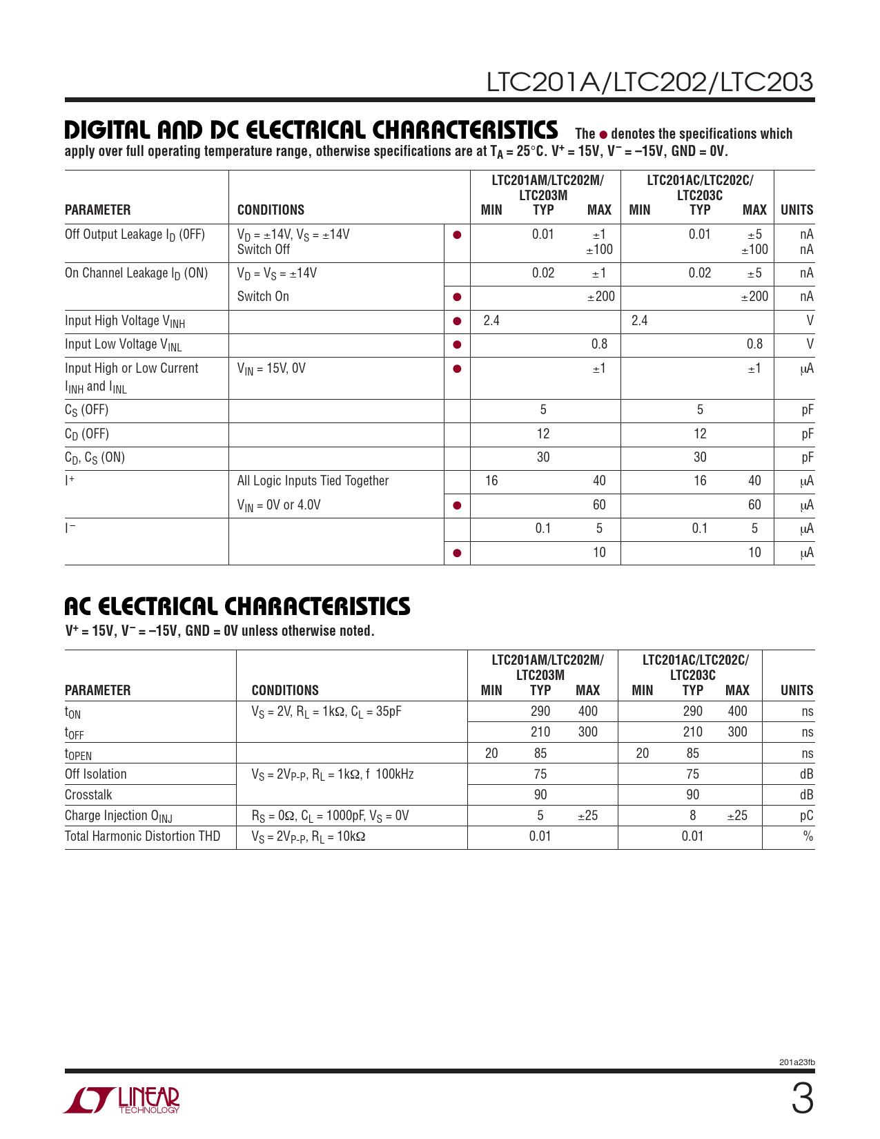 AC ELECTRICAL CHARACTERISTICS V+ = 15V, V– = –15V, GND = 0V unless otherwise noted. LTC201AM/LTC202M/ LTC201AC/LTC202C/ LTC203M LTC203C PARAMETER CONDITIONS MIN TYP MAX MIN TYP MAX UNITS