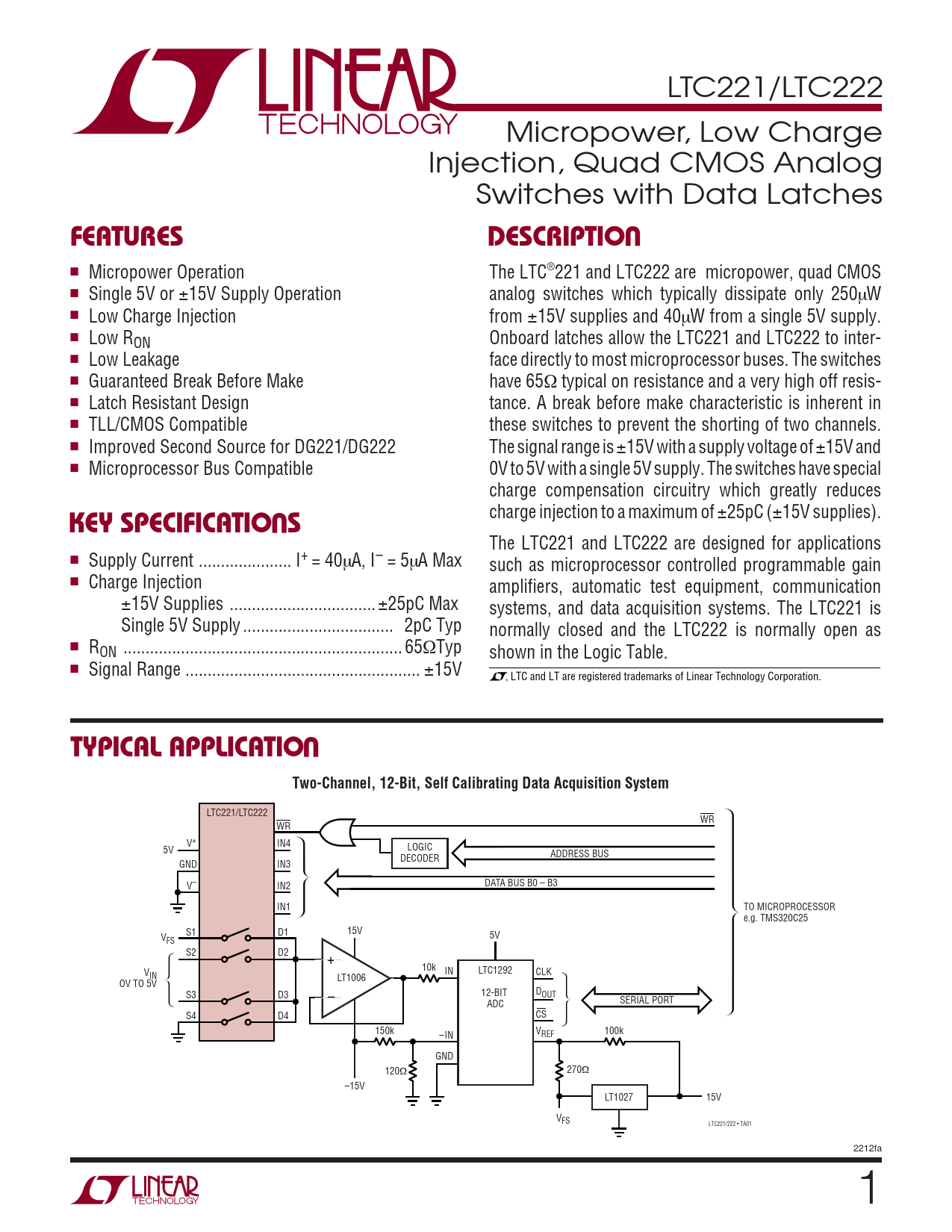 LTC221/LTC222 Micropower, Low Charge Injection, Quad CMOS Analog Switches with Data Latches UFEATURESDESCRIPTIO ■ Micropower Operation The LTC®221 and LTC222 are micropower, quad CMOS ■ Single 5V or ±15V Supply Operation analog switches which typically dissipate only 250µW ■ Low Charge Injection from ±15V supplies and 40µW from a single 5V supply. ■ Low RON Onboard latches allow the LTC221 and LTC222 to inter- ■ Low Leakage face directly to most microprocessor buses. The switches ■ Guaranteed Break Before Make have 65Ω typical on resistance and a very high off resis- ■ Latch Resistant Design tance. A break before make characteristic is inherent in ■ TLL/CMOS Compatible these switches to prevent the shorting of two channels. ■ Improved Second Source for DG221/DG222 The signal range is ±15V with a supply voltage of ±15V and ■ Microprocessor Bus Compatible 0V to 5V with a single 5V supply. The switches have special charge compensation circuitry which greatly reduces U charge injection to a maximum of ±25pC (±15V supplies). KEY SPECIFICATIO S The LTC221 and LTC222 are designed for applications ■ Supply Current ... I+ = 40µA, I– = 5µA Max such as microprocessor controlled programmable gain ■ Charge Injection amplifiers, automatic test equipment, communication ±15V Supplies ... ±25pC Max systems, and data acquisition systems. The LTC221 is Single 5V Supply .. 2pC Typ normally closed and the LTC222 is normally open as ■ RON ... 65ΩTyp shown in the Logic Table. ■ Signal Range ... ±15V , LTC and LT are registered trademarks of Linear Technology Corporation. UTYPICAL APPLICATIOTwo-Channel, 12-Bit, Self Calibrating Data Acquisition System LTC221/LTC222 WR WR V+ IN4 5V LOGIC ADDRESS BUS DECODER GND IN3 V– IN2 DATA BUS B0 – B3 IN1 TO MICROPROCESSOR e.g. TMS320C25 S1 D1 15V 5V VFS S2 D2 + 10k V IN LTC1292 CLK IN LT1006 OV TO 5V D S3 D3 12-BIT OUT – ADC SERIAL PORT S4 D4 CS 150k R1 –IN V 100k REF GND 120Ω 270Ω –15V LT1027 15V VFS LTC221/222 • TA01 2212fa 1