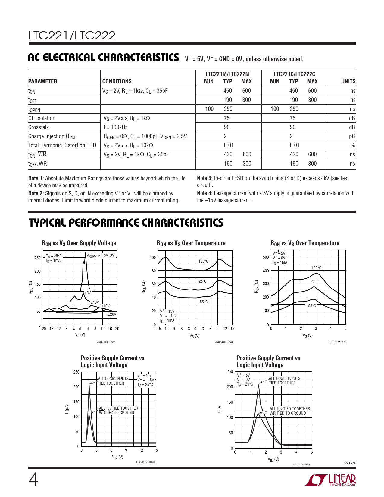 LTC221/LTC222 AC ELECTRICAL CHARACTERISTICS V+ = 5V, V– = GND = 0V, unless otherwise noted.LTC221M/LTC222M LTC221C/LTC222CPARAMETERCONDITIONSMINTYPMAXMINTYPMAXUNITS tON VS = 2V, RL = 1kΩ, CL = 35pF 450 600 450 600 ns tOFF 190 300 190 300 ns tOPEN 100 250 100 250 ns Off Isolation VS = 2VP-P, RL = 1kΩ 75 75 dB Crosstalk f = 100kHz 90 90 dB Charge Injection OINJ RGEN = 0Ω, CL = 1000pF, VGEN = 2.5V 2 2 pC Total Harmonic Distortion THD VS = 2VP-P, RL = 10kΩ 0.01 0.01 % tON, WR VS = 2V, RL = 1kΩ, CL = 35pF 430 600 430 600 ns tOFF, WR 160 300 160 300 ns Note 1: Absolute Maximum Ratings are those values beyond which the life Note 3: In-circuit ESD on the switch pins (S or D) exceeds 4kV (see test of a device may be impaired. circuit). Note 2: Signals on S, D, or IN exceeding V+ or V– will be clamped by Note 4: Leakage current with a 5V supply is guaranteed by correlation with internal diodes. Limit forward diode current to maximum current rating. the ±15V leakage current. WUTYPICAL PERFOR A CE CHARACTERISTICSRON vs VS Over Supply VoltageRON vs VS Over TemperatureRON vs VS Over Temperature V + = 5V T V 250 A = 25°C SUPPLY = 5V, OV 100 500 V – = 0V ID = 1mA 125°C ID = 1mA 125°C 200 80 400 ) 25°C ) 25°C Ω 150 Ω 60 Ω 300 ( ON ON ON R ±5V R R 100 40 200 ±10V –55°C ±15V –55°C 50 20 V + = 15V 100 ±20V V – = –15V ID = 1mA 0 0 0 –20 –16 –12 –8 –4 0 4 8 12 16 20 –15 –12 –9 –6 –3 0 3 6 9 12 15 0 1 2 3 4 5 VS (V) VS (V) VS (V) LTC221/222 • TPC01 LTC221/222 • TPC02 LTC221/222 • TPC03 Positive Supply Current vsPositive Supply Current vsLogic Input VoltageLogic Input Voltage 250 250 V + = 15V V + = 5V ALL LOGIC INPUTS ALL LOGIC INPUTS V – = –15V V – = 0V TIED TOGETHER TIED TOGETHER T T 200 A = 25°C 200 A = 25°C 150 150 A) A) (µ ALL INX TIED TOGETHER (µ ALL INX TIED TOGETHER + I WR TIED TO GROUND + I WR TIED TO GROUND 100 100 50 50 0 0 0 3 6 9 12 15 0 1 2 3 4 5 VIN (V) VIN (V) LTC221/222 • TPC04 2212fa LTC221/222 • TPC05 4