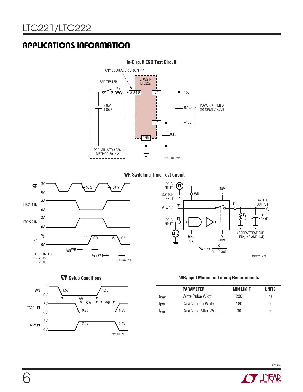 ANY SOURCE OR DRAIN PIN LTC221/ ESD TESTER LTC222 1.5k V+ S OR D 15V ±4kV POWER APPLIED 0.1µF 100pF OR OPEN CIRCUT V– –15V 0.1µF GND PER MIL-STD-883C METHOD 3015.2 LTC221/222 • TA07