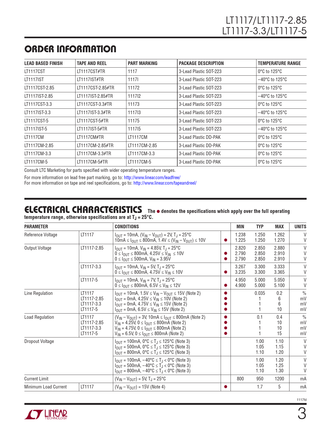 LT1117CST LT1117CST#TR 1117 3-Lead Plastic SOT-223 0°C to 125°C LT1117IST LT1117IST#TR 1117I 3-Lead Plastic SOT-223 –40°C to 125°C LT1117CST-2.85 LT1117CST-2.85#TR 11172 3-Lead Plastic SOT-223 0°C to 125°C LT1117IST-2.85 LT1117IST-2.85#TR 1117I2 3-Lead Plastic SOT-223 –40°C to 125°C LT1117CST-3.3 LT1117CST-3.3#TR 11173 3-Lead Plastic SOT-223 0°C to 125°C LT1117IST-3.3 LT1117IST-3.3#TR 1117I3 3-Lead Plastic SOT-223 –40°C to 125°C LT1117CST-5 LT1117CST-5#TR 11175 3-Lead Plastic SOT-223 0°C to 125°C LT1117IST-5 LT1117IST-5#TR 1117I5 3-Lead Plastic SOT-223 –40°C to 125°C LT1117CM LT1117CM#TR LT1117CM 3-Lead Plastic DD-PAK 0°C to 125°C LT1117CM-2.85 LT1117CM-2.85#TR LT1117CM-2.85 3-Lead Plastic DD-PAK 0°C to 125°C LT1117CM-3.3 LT1117CM-3.3#TR LT1117CM-3.3 3-Lead Plastic DD-PAK 0°C to 125°C LT1117CM-5 LT1117CM-5#TR LT1117CM-5 3-Lead Plastic DD-PAK 0°C to 125°C Consult LTC Marketing for parts specified with wider operating temperature ranges. For more information on lead free part marking, go to: http://www.linear.com/leadfree/ For more information on tape and reel specifications, go to: http://www.linear.com/tapeandreel/