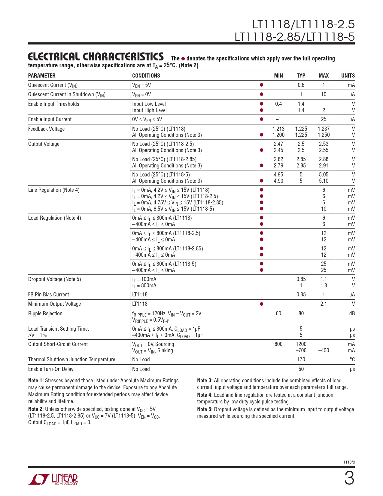 Quiescent Current (VIN) VEN = 5V l 0.6 1 mA Quiescent Current in Shutdown (VIN) VEN = 0V l 1 10 μA Enable Input Thresholds Input Low Level l 0.4 1.4 V Input High Level l 1.4 2 V Enable Input Current 0V ≤ VEN ≤ 5V l –1 25 μA Feedback Voltage No Load (25°C) (LT1118) 1.213 1.225 1.237 V All Operating Conditions (Note 3) l 1.200 1.225 1.250 V Output Voltage No Load (25°C) (LT1118-2.5) 2.47 2.5 2.53 V All Operating Conditions (Note 3) l 2.45 2.5 2.55 V No Load (25°C) (LT1118-2.85) 2.82 2.85 2.88 V All Operating Conditions (Note 3) l 2.79 2.85 2.91 V No Load (25°C) (LT1118-5) 4.95 5 5.05 V All Operating Conditions (Note 3) l 4.90 5 5.10 V Line Regulation (Note 4) IL = 0mA, 4.2V ≤ VIN ≤ 15V (LT1118) l 6 mV IL = 0mA, 4.2V ≤ VIN ≤ 15V (LT1118-2.5) l 6 mV IL = 0mA, 4.75V ≤ VIN ≤ 15V (LT1118-2.85) l 6 mV IL = 0mA, 6.5V ≤ VIN ≤ 15V (LT1118-5) l 10 mV Load Regulation (Note 4) 0mA ≤ IL ≤ 800mA (LT1118) l 6 mV – 400mA ≤ IL ≤ 0mA l 6 mV 0mA ≤ IL ≤ 800mA (LT1118-2.5) l 12 mV – 400mA ≤ IL ≤ 0mA l 12 mV 0mA ≤ IL ≤ 800mA (LT1118-2.85) l 12 mV – 400mA ≤ IL ≤ 0mA l 12 mV 0mA ≤ IL ≤ 800mA (LT1118-5) l 25 mV – 400mA ≤ IL ≤ 0mA l 25 mV Dropout Voltage (Note 5) IL = 100mA 0.85 1.1 V IL = 800mA 1 1.3 V FB Pin Bias Current LT1118 0.35 1 μA Minimum Output Voltage LT1118 l 2.1 V Ripple Rejection fRIPPLE = 120Hz, VIN – VOUT = 2V 60 80 dB VRIPPLE = 0.5VP-P Load Transient Settling Time, 0mA ≤ IL ≤ 800mA, CLOAD = 1μF 5 μs ΔV = 1% –400mA ≤ IL ≤ 0mA, CLOAD = 1μF 5 μs Output Short-Circuit Current VOUT = 0V, Sourcing 800 1200 mA VOUT = VIN, Sinking –700 –400 mA Thermal Shutdown Junction Temperature No Load 170 °C Enable Turn-On Delay No Load 50 μs