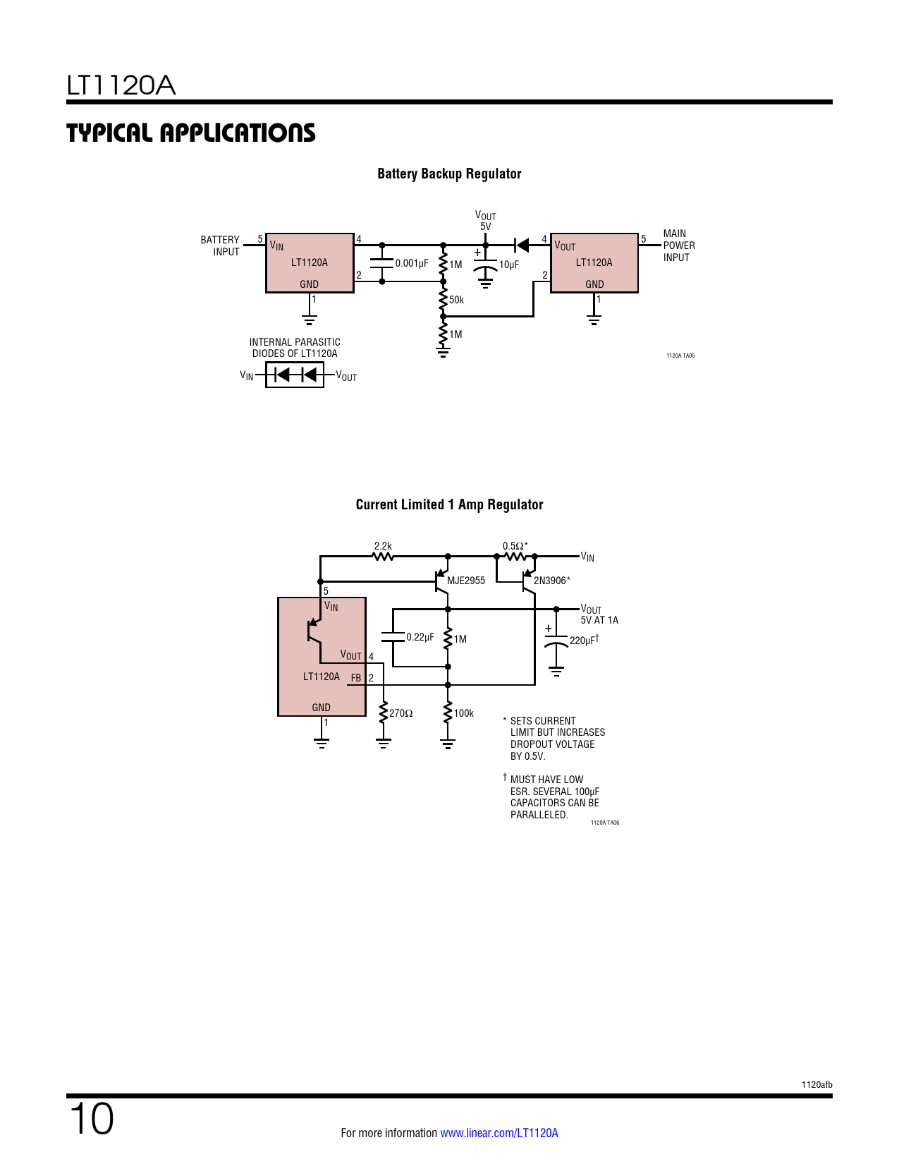 LT1120A Typical applicaTionsBattery Backup Regulator VOUT 5V BATTERY 5 V 4 5 MAIN IN V 4 OUT VOUT V INPUT IN POWER + LT1120A 0.001µF INPUT 1M 10µF LT1120A FB 2 2 GND FB GND 1 50k 1 1M INTERNAL PARASITIC DIODES OF LT1120A 1120A TA05 VIN VOUT Current Limited 1 Amp Regulator 2.2k 0.5Ω* VIN MJE2955 2N3906* 5 VIN VOUT + 5V AT 1A 0.22µF 1M 220µF† VOUT 4 LT1120A FB 2 GND 270Ω 100k 1 * SETS CURRENT LIMIT BUT INCREASES DROPOUT VOLTAGE BY 0.5V. † MUST HAVE LOW ESR. SEVERAL 100µF CAPACITORS CAN BE PARALLELED. 1120A TA06 1120afb 10 For more information www.linear.com/LT1120A Document Outline Features Description Applications Typical Application Absolute Maximum Ratings Pin Configuration Order Information Electrical Characteristics Typical Performance Characteristics Pin Functions Block Diagram Applications Information Typical Applications Package Description Revision History Related Parts
