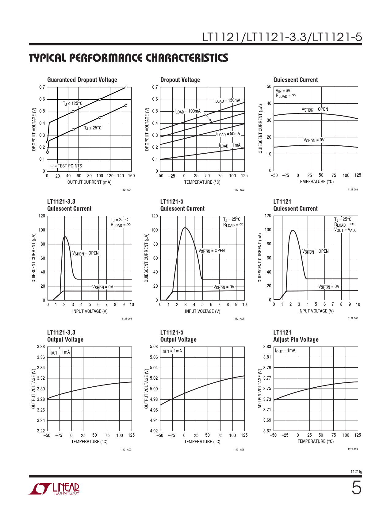 TYPICAL PERFORMANCE CHARACTERISTICS. Guaranteed Dropout Voltage. Dropout Voltage. Quiescent Current. LT1121-3.3. LT1121-5. LT1121