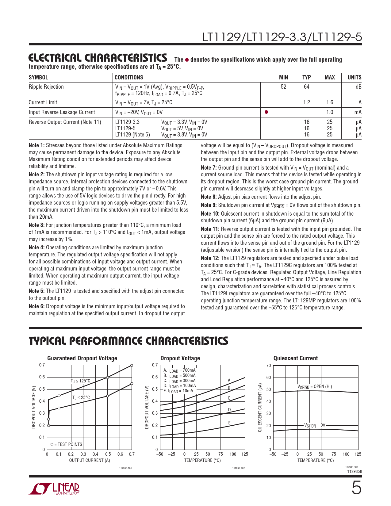 LT1129/LT1129-3.3/LT1129-5 ELECTRICAL CHARACTERISTICSThe l denotes the specifi cations which apply over the full operatingtemperature range, otherwise specifi cations are at TA = 25°C.SYMBOLCONDITIONSMINTYPMAXUNITS Ripple Rejection VIN – VOUT = 1V (Avg), VRIPPLE = 0.5VP-P, 52 64 dB fRIPPLE = 120Hz, ILOAD = 0.7A, TJ = 25°C Current Limit VIN – VOUT = 7V, TJ = 25°C 1.2 1.6 A Input Reverse Leakage Current VIN = –20V, VOUT = 0V l 1.0 mA Reverse Output Current (Note 11) LT1129-3.3 VOUT = 3.3V, VIN = 0V 16 25 μA LT1129-5 VOUT = 5V, VIN = 0V 16 25 μA LT1129 (Note 5) VOUT = 3.8V, VIN = 0V 16 25 μA Note 1: Stresses beyond those listed under Absolute Maximum Ratings voltage will be equal to (VIN – VDROPOUT). Dropout voltage is measured may cause permanent damage to the device. Exposure to any Absolute between the input pin and the output pin. External voltage drops between Maximum Rating condition for extended periods may affect device the output pin and the sense pin will add to the dropout voltage. reliability and lifetime. Note 7: Ground pin current is tested with VIN = VOUT (nominal) and a Note 2: The shutdown pin input voltage rating is required for a low current source load. This means that the device is tested while operating in impedance source. Internal protection devices connected to the shutdown its dropout region. This is the worst case ground pin current. The ground pin will turn on and clamp the pin to approximately 7V or – 0.6V. This pin current will decrease slightly at higher input voltages. range allows the use of 5V logic devices to drive the pin directly. For high Note 8: Adjust pin bias current fl ows into the adjust pin. impedance sources or logic running on supply voltages greater than 5.5V, Note 9: Shutdown pin current at VSHDN = 0V fl ows out of the shutdown pin. the maximum current driven into the shutdown pin must be limited to less Note 10: Quiescent current in shutdown is equal to the sum total of the than 20mA. shutdown pin current (6μA) and the ground pin current (9μA). Note 3: For junction temperatures greater than 110°C, a minimum load Note 11: Reverse output current is tested with the input pin grounded. The of 1mA is recommended. For TJ > 110°C and IOUT < 1mA, output voltage output pin and the sense pin are forced to the rated output voltage. This may increase by 1%. current fl ows into the sense pin and out of the ground pin. For the LT1129 Note 4: Operating conditions are limited by maximum junction (adjustable version) the sense pin is internally tied to the output pin. temperature. The regulated output voltage specifi cation will not apply Note 12: The LT1129 regulators are tested and specifi ed under pulse load for all possible combinations of input voltage and output current. When conditions such that TJ ≅ TA. The LT1129C regulators are 100% tested at operating at maximum input voltage, the output current range must be TA = 25°C. For C-grade devices, Regulated Output Voltage, Line Regulation limited. When operating at maximum output current, the input voltage and Load Regulation performance at –40°C and 125°C is assured by range must be limited. design, characterization and correlation with statistical process controls. Note 5: The LT1129 is tested and specifi ed with the adjust pin connected The LT1129I regulators are guaranteed over the full –40°C to 125°C to the output pin. operating junction temperature range. The LT1129MP regulators are 100% Note 6: Dropout voltage is the minimum input/output voltage required to tested and guaranteed over the –55°C to 125°C temperature range. maintain regulation at the specifi ed output current. In dropout the output TYPICAL PERFORMANCE CHARACTERISTICSGuaranteed Dropout VoltageDropout VoltageQuiescent Current 0.7 0.7 70 A. ILOAD = 700mA 0.6 0.6 B. ILOAD = 500mA 60 TJ ≤ 125°C C. I A LOAD = 300mA D. ILOAD = 100mA V 0.5 0.5 B SHDN = OPEN (HI) E. I 50 LOAD = 10mA GE (V) T C TA J ≤ 25°C 0.4 0.4 40 D 0.3 0.3 30 E DROPOUT VOL 0.2 0.2 V DROPOUT VOLTAGE (V) 20 SHDN = 0V QUIESCENT CURRENT (μA) 0.1 0.1 10 = TEST POINTS 0 0 0 0 0.1 0.2 0.3 0.4 0.5 0.6 0.7 –50 –25 0 25 50 75 100 125 –50 –25 0 25 50 75 100 125 OUTPUT CURRENT (A) TEMPERATURE (°C) TEMPERATURE (°C) 112935 G01 112935 G02 112935 G03 112935ff 5