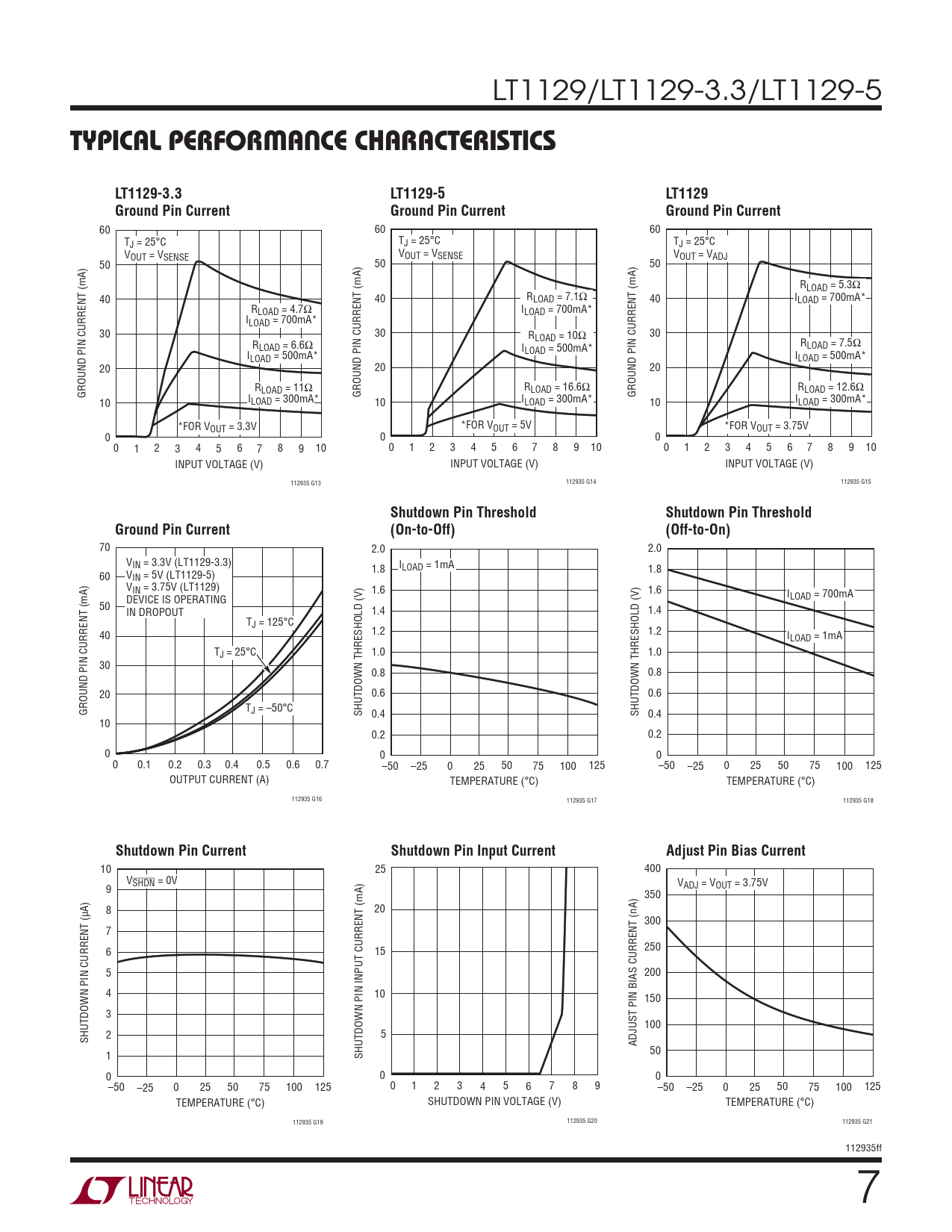 TYPICAL PERFORMANCE CHARACTERISTICS. LT1129-3.3. LT1129-5. LT1129. Ground Pin Current. Shutdown Pin Threshold. (On-to-Off)