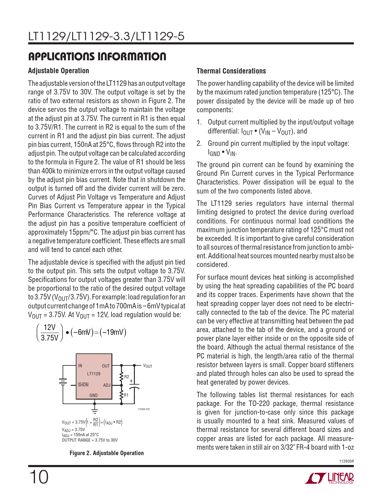 LT1129/LT1129-3.3/LT1129-5 APPLICATIONS INFORMATIONAdjustable OperationThermal Considerations The adjustable version of the LT1129 has an output voltage The power handling capability of the device will be limited range of 3.75V to 30V. The output voltage is set by the by the maximum rated junction temperature (125°C). The ratio of two external resistors as shown in Figure 2. The power dissipated by the device will be made up of two device servos the output voltage to maintain the voltage components: at the adjust pin at 3.75V. The current in R1 is then equal 1. Output current multiplied by the input/output voltage to 3.75V/R1. The current in R2 is equal to the sum of the differential: IOUT • (VIN – VOUT), and current in R1 and the adjust pin bias current. The adjust pin bias current, 150nA at 25°C, fl ows through R2 into the 2. Ground pin current multiplied by the input voltage: adjust pin. The output voltage can be calculated according IGND • VIN. to the formula in Figure 2. The value of R1 should be less The ground pin current can be found by examining the than 400k to minimize errors in the output voltage caused Ground Pin Current curves in the Typical Performance by the adjust pin bias current. Note that in shutdown the Characteristics. Power dissipation will be equal to the output is turned off and the divider current will be zero. sum of the two components listed above. Curves of Adjust Pin Voltage vs Temperature and Adjust The LT1129 series regulators have internal thermal Pin Bias Current vs Temperature appear in the Typical limiting designed to protect the device during overload Performance Characteristics. The reference voltage at conditions. For continuous normal load conditions the the adjust pin has a positive temperature coeffi cient of maximum junction temperature rating of 125°C must not approximately 15ppm/°C. The adjust pin bias current has be exceeded. It is important to give careful consideration a negative temperature coeffi cient. These effects are small to all sources of thermal resistance from junction to ambi- and will tend to cancel each other. ent. Additional heat sources mounted nearby must also be The adjustable device is specifi ed with the adjust pin tied considered. to the output pin. This sets the output voltage to 3.75V. For surface mount devices heat sinking is accomplished Specifi cations for output voltages greater than 3.75V will by using the heat spreading capabilities of the PC board be proportional to the ratio of the desired output voltage and its copper traces. Experiments have shown that the to 3.75V (VOUT/3.75V). For example: load regulation for an heat spreading copper layer does not need to be electri- output current change of 1mA to 700mA is – 6mV typical at cally connected to the tab of the device. The PC material VOUT = 3.75V. At VOUT = 12V, load regulation would be: can be very effective at transmitting heat between the pad 12V area, attached to the tab of the device, and a ground or ( )=( ) –19mV 3.75V • –6mV power plane layer either inside or on the opposite side of the board. Although the actual thermal resistance of the PC material is high, the length/area ratio of the thermal IN OUT VOUT resistor between layers is small. Copper board stiffeners LT1129 and plated through holes can also be used to spread the R2 + heat generated by power devices. SHDN ADJ GND R1 The following tables list thermal resistances for each package. For the TO-220 package, thermal resistance 112935 F02 is given for junction-to-case only since this package R2 VOUT = 3.75V 1 + + IADJ • R2 is usually mounted to a heat sink. Measured values of ( ) ( ) R1 VADJ = 3.75V thermal resistance for several different board sizes and IADJ = 150nA at 25°C OUTPUT RANGE = 3.75V to 30V copper areas are listed for each package. All measure- ments were taken in still air on 3/32" FR-4 board with 1-oz Figure 2. Adjustable Operation 112935ff 10