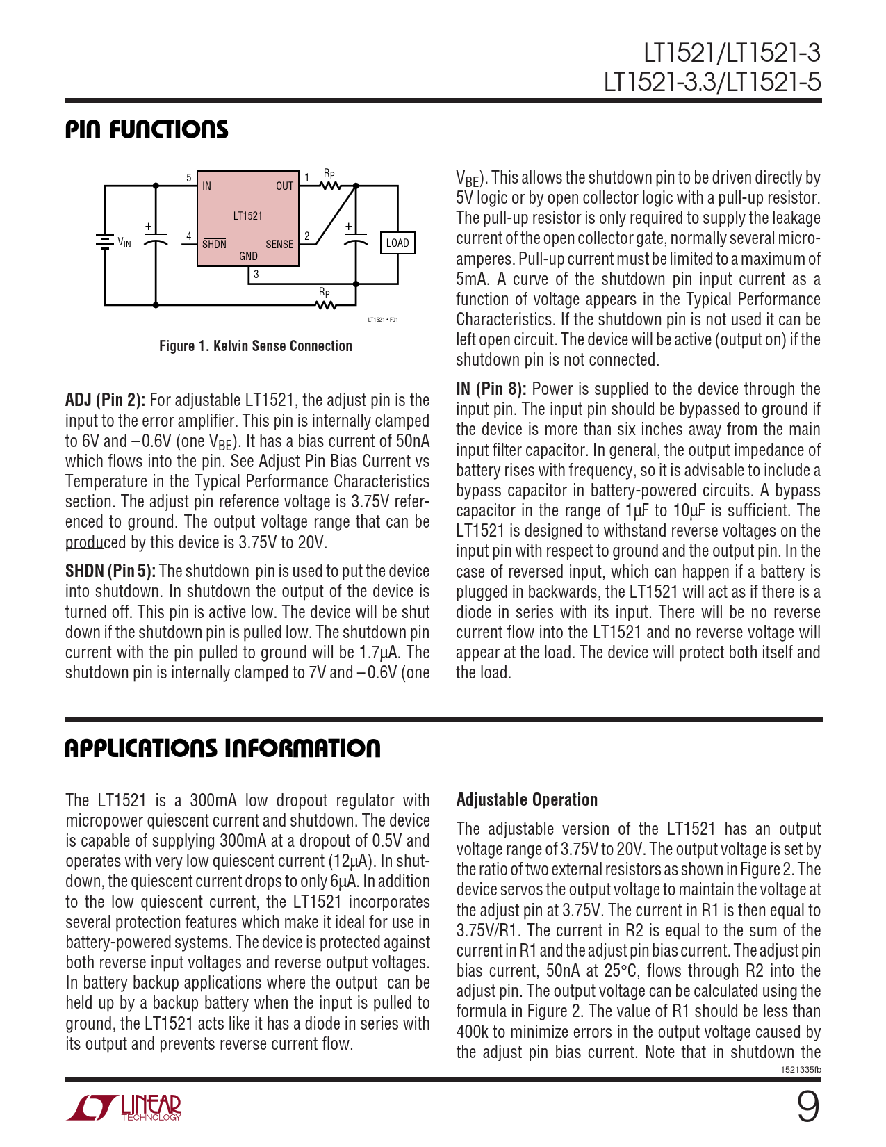 LT1521/LT1521-3 LT1521-3.3/LT1521-5 UUUPIN FUNCTIONS R 5 1 P VBE). This allows the shutdown pin to be driven directly by IN OUT 5V logic or by open collector logic with a pull-up resistor. LT1521 The pull-up resistor is only required to supply the leakage + + 4 2 V LOAD current of the open collector gate, normally several micro- IN SHDN SENSE GND amperes. Pull-up current must be limited to a maximum of 3 5mA. A curve of the shutdown pin input current as a RP function of voltage appears in the Typical Performance LT1521 • F01 Characteristics. If the shutdown pin is not used it can be left open circuit. The device will be active (output on) if the Figure 1. Kelvin Sense Connection shutdown pin is not connected. IN (Pin 8): Power is supplied to the device through the ADJ (Pin 2): For adjustable LT1521, the adjust pin is the input pin. The input pin should be bypassed to ground if input to the error amplifier. This pin is internally clamped the device is more than six inches away from the main to 6V and – 0.6V (one VBE). It has a bias current of 50nA input filter capacitor. In general, the output impedance of which flows into the pin. See Adjust Pin Bias Current vs battery rises with frequency, so it is advisable to include a Temperature in the Typical Performance Characteristics bypass capacitor in battery-powered circuits. A bypass section. The adjust pin reference voltage is 3.75V refer- capacitor in the range of 1µF to 10µF is sufficient. The enced to ground. The output voltage range that can be LT1521 is designed to withstand reverse voltages on the produced by this device is 3.75V to 20V. input pin with respect to ground and the output pin. In the SHDN (Pin 5): The shutdown pin is used to put the device case of reversed input, which can happen if a battery is into shutdown. In shutdown the output of the device is plugged in backwards, the LT1521 will act as if there is a turned off. This pin is active low. The device will be shut diode in series with its input. There will be no reverse down if the shutdown pin is pulled low. The shutdown pin current flow into the LT1521 and no reverse voltage will current with the pin pulled to ground will be 1.7µA. The appear at the load. The device will protect both itself and shutdown pin is internally clamped to 7V and – 0.6V (one the load. UUWUAPPLICATIONS INFORMATION The LT1521 is a 300mA low dropout regulator with Adjustable Operation micropower quiescent current and shutdown. The device The adjustable version of the LT1521 has an output is capable of supplying 300mA at a dropout of 0.5V and voltage range of 3.75V to 20V. The output voltage is set by operates with very low quiescent current (12µA). In shut- the ratio of two external resistors as shown in Figure 2. The down, the quiescent current drops to only 6µA. In addition device servos the output voltage to maintain the voltage at to the low quiescent current, the LT1521 incorporates the adjust pin at 3.75V. The current in R1 is then equal to several protection features which make it ideal for use in 3.75V/R1. The current in R2 is equal to the sum of the battery-powered systems. The device is protected against current in R1 and the adjust pin bias current. The adjust pin both reverse input voltages and reverse output voltages. bias current, 50nA at 25°C, flows through R2 into the In battery backup applications where the output can be adjust pin. The output voltage can be calculated using the held up by a backup battery when the input is pulled to formula in Figure 2. The value of R1 should be less than ground, the LT1521 acts like it has a diode in series with 400k to minimize errors in the output voltage caused by its output and prevents reverse current flow. the adjust pin bias current. Note that in shutdown the 1521335fb 9
