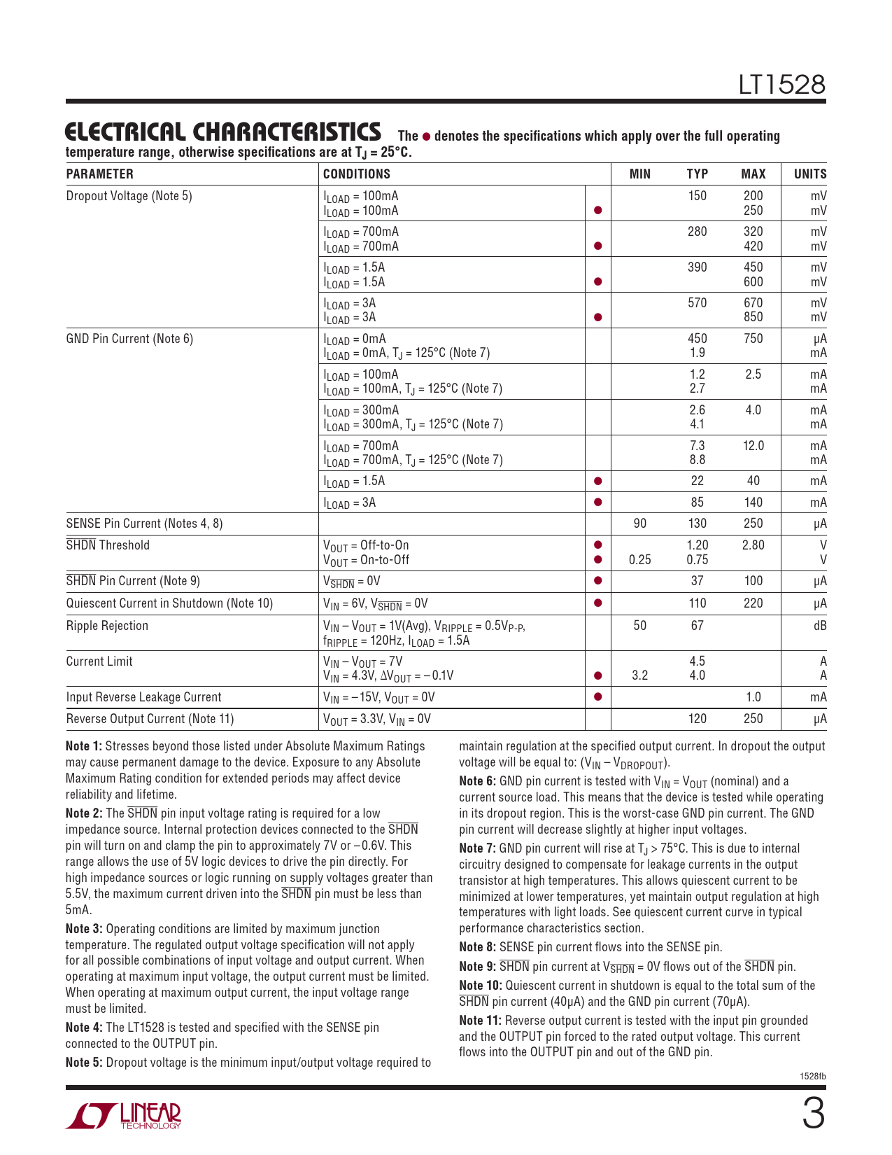 Dropout Voltage (Note 5) ILOAD = 100mA 150 200 mV ILOAD = 100mA l 250 mV ILOAD = 700mA 280 320 mV ILOAD = 700mA l 420 mV ILOAD = 1.5A 390 450 mV ILOAD = 1.5A l 600 mV ILOAD = 3A 570 670 mV ILOAD = 3A l 850 mV GND Pin Current (Note 6) ILOAD = 0mA 450 750 μA ILOAD = 0mA, TJ = 125°C (Note 7) 1.9 mA ILOAD = 100mA 1.2 2.5 mA ILOAD = 100mA, TJ = 125°C (Note 7) 2.7 mA ILOAD = 300mA 2.6 4.0 mA ILOAD = 300mA, TJ = 125°C (Note 7) 4.1 mA ILOAD = 700mA 7.3 12.0 mA ILOAD = 700mA, TJ = 125°C (Note 7) 8.8 mA ILOAD = 1.5A l 22 40 mA ILOAD = 3A l 85 140 mA SENSE Pin Current (Notes 4, 8) 90 130 250 μA SHDN Threshold VOUT = Off-to-On l 1.20 2.80 V VOUT = On-to-Off l 0.25 0.75 V SHDN Pin Current (Note 9) VSHDN = 0V l 37 100 μA Quiescent Current in Shutdown (Note 10) VIN = 6V, VSHDN = 0V l 110 220 μA Ripple Rejection VIN – VOUT = 1V(Avg), VRIPPLE = 0.5VP-P, 50 67 dB fRIPPLE = 120Hz, ILOAD = 1.5A Current Limit VIN – VOUT = 7V 4.5 A VIN = 4.3V, ΔVOUT = – 0.1V l 3.2 4.0 A Input Reverse Leakage Current VIN = – 15V, VOUT = 0V l 1.0 mA Reverse Output Current (Note 11) VOUT = 3.3V, VIN = 0V 120 250 μA