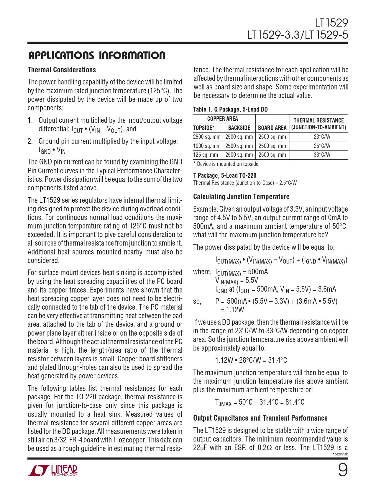 thermal resistance for several different copper areas are listed for the DD package. All measurements were taken in The LT1529 is designed to be stable with a wide range of still air on 3/32" FR-4 board with 1-oz copper. This data can output capacitors. The minimum recommended value is be used as a rough guideline in estimating thermal resis- 22µF with an ESR of 0.2Ω or less. The LT1529 is a 152935fb 9