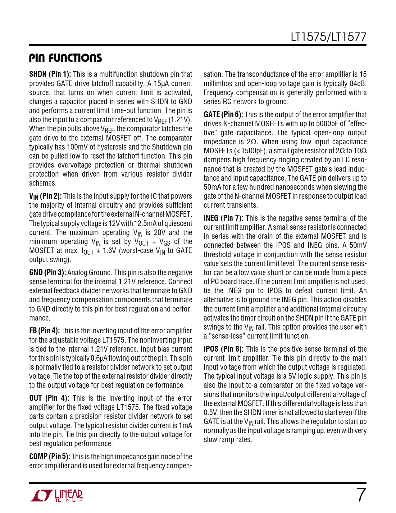 Pages / Page20 / 7 — PIN FUNCTIONS. SHDN (Pin 1):. GATE (Pin 6):. VIN (Pin 2):. INEG (Pin 7):. …
