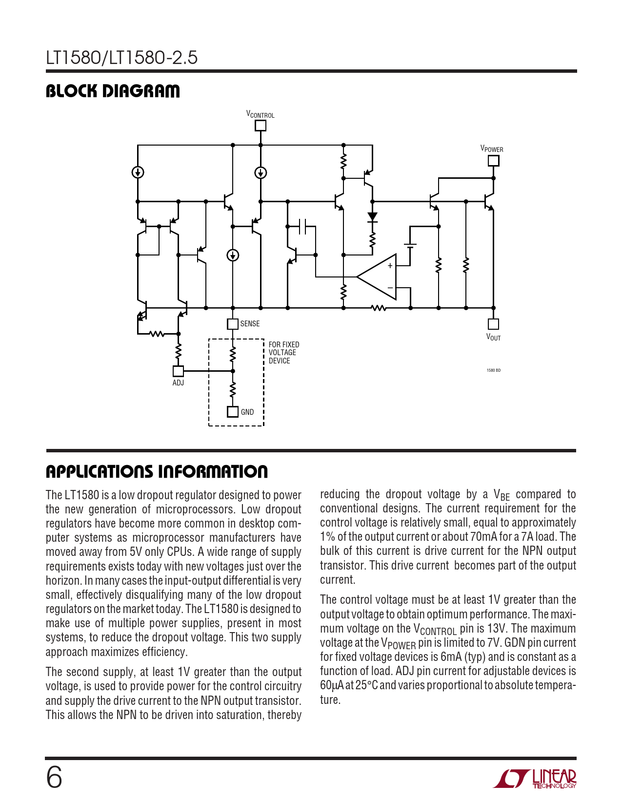 LT1580/LT1580-2.5 WBLOCK DIAGRA VCONTROL VPOWER + – SENSE VOUT FOR FIXED VOLTAGE DEVICE 1580 BD ADJ GND UUWUAPPLICATIONS INFORMATION The LT1580 is a low dropout regulator designed to power reducing the dropout voltage by a VBE compared to the new generation of microprocessors. Low dropout conventional designs. The current requirement for the regulators have become more common in desktop com- control voltage is relatively small, equal to approximately puter systems as microprocessor manufacturers have 1% of the output current or about 70mA for a 7A load. The moved away from 5V only CPUs. A wide range of supply bulk of this current is drive current for the NPN output requirements exists today with new voltages just over the transistor. This drive current becomes part of the output horizon. In many cases the input-output differential is very current. small, effectively disqualifying many of the low dropout The control voltage must be at least 1V greater than the regulators on the market today. The LT1580 is designed to output voltage to obtain optimum performance. The maxi- make use of multiple power supplies, present in most mum voltage on the VCONTROL pin is 13V. The maximum systems, to reduce the dropout voltage. This two supply voltage at the VPOWER pin is limited to 7V. GDN pin current approach maximizes efficiency. for fixed voltage devices is 6mA (typ) and is constant as a The second supply, at least 1V greater than the output function of load. ADJ pin current for adjustable devices is voltage, is used to provide power for the control circuitry 60µA at 25°C and varies proportional to absolute tempera- and supply the drive current to the NPN output transistor. ture. This allows the NPN to be driven into saturation, thereby 6