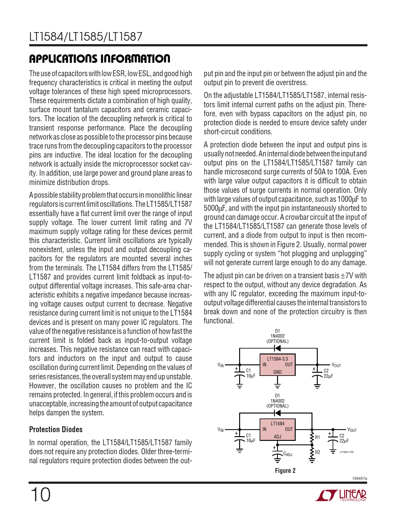 VIN IN OUT VOUT + + C1 ADJ C2 R1 In normal operation, the LT1584/LT1585/LT1587 family 10µF 22µF + does not require any protection diodes. Older three-termi- LT1584 • F02 R2 CADJ nal regulators require protection diodes between the out-
