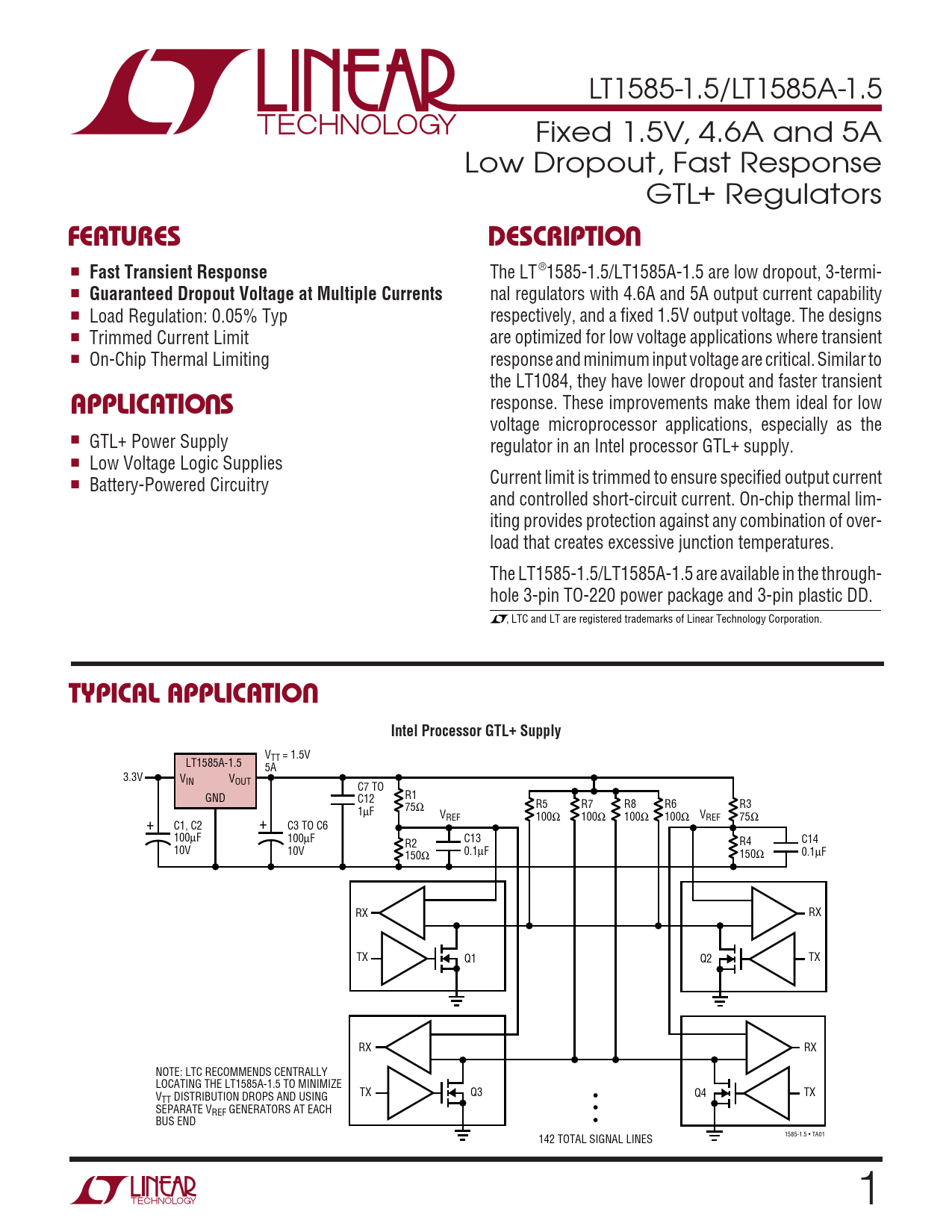 LT1585-1.5/LT1585A-1.5 Fixed 1.5V, 4.6A and 5A Low Dropout, Fast Response GTL+ Regulators