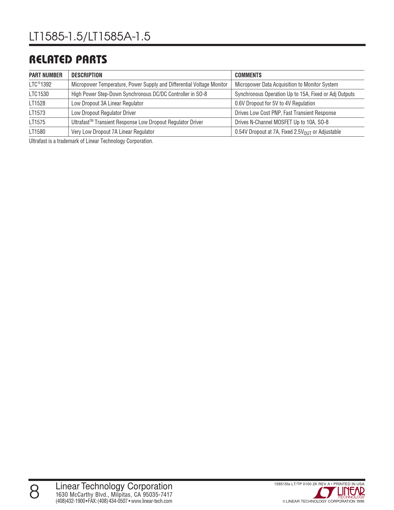 LTC®1392 Micropower Temperature, Power Supply and Differential Voltage Monitor Micropower Data Acquisition to Monitor System LTC1530 High Power Step-Down Synchronous DC/DC Controller in SO-8 Synchronous Operation Up to 15A, Fixed or Adj Outputs LT1528 Low Dropout 3A Linear Regulator 0.6V Dropout for 5V to 4V Regulation LT1573 Low Dropout Regulator Driver Drives Low Cost PNP, Fast Transient Response LT1575 UltrafastTM Transient Response Low Dropout Regulator Driver Drives N-Channel MOSFET Up to 10A, SO-8 LT1580 Very Low Dropout 7A Linear Regulator 0.54V Dropout at 7A, Fixed 2.5VOUT or Adjustable Ultrafast is a trademark of Linear Technology Corporation. 158515fa LT/TP 0100 2K REV A • PRINTED IN USA 8 Linear Technology Corporation 1630 McCarthy Blvd., Milpitas, CA 95035-7417 (408) 432-1900 ● FAX: (408) 434-0507 ● www.linear-tech.com LINEAR TECHNOLOGY CORPORATION 1996