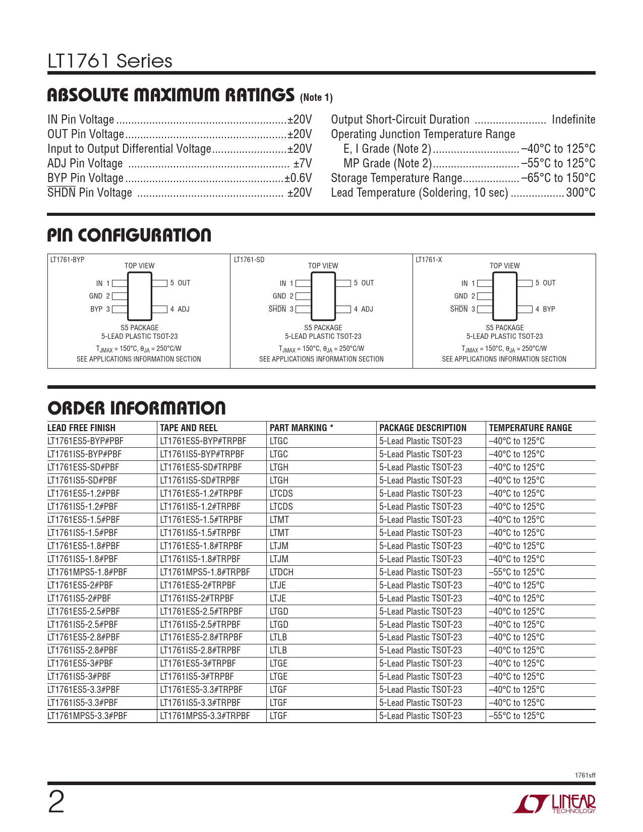 LT1761-BYP LT1761-SD LT1761-X TOP VIEW TOP VIEW TOP VIEW IN 1 5 OUT IN 1 5 OUT IN 1 5 OUT GND 2 GND 2 GND 2 BYP 3 4 ADJ SHDN 3 4 ADJ SHDN 3 4 BYP S5 PACKAGE S5 PACKAGE S5 PACKAGE 5-LEAD PLASTIC TSOT-23 5-LEAD PLASTIC TSOT-23 5-LEAD PLASTIC TSOT-23 TJMAX = 150°C, θJA = 250°C/W TJMAX = 150°C, θJA = 250°C/W TJMAX = 150°C, θJA = 250°C/W SEE APPLICATIONS INFORMATION SECTION SEE APPLICATIONS INFORMATION SECTION SEE APPLICATIONS INFORMATION SECTION